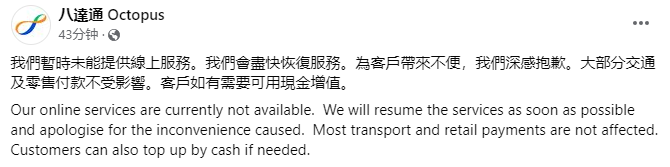 八達通今早10時許在社交平台緊急置頂帖文,表示暫時未能提供線上服務,不過大部分交通及零售付款不受影響。八達通表示會盡快恢復服務,建議用戶如有需要可用現金增值。