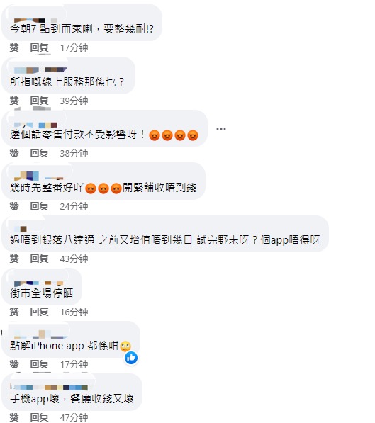 大批網民湧入專頁大倒苦水,表示一打開App就彈去維修窗口,有商舖東主呻「開緊舖收唔到錢」,還有網民指iOS版八達通亦無法使用,甚至零售付款亦受到影響。