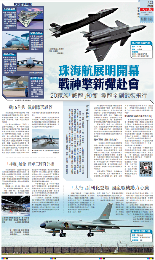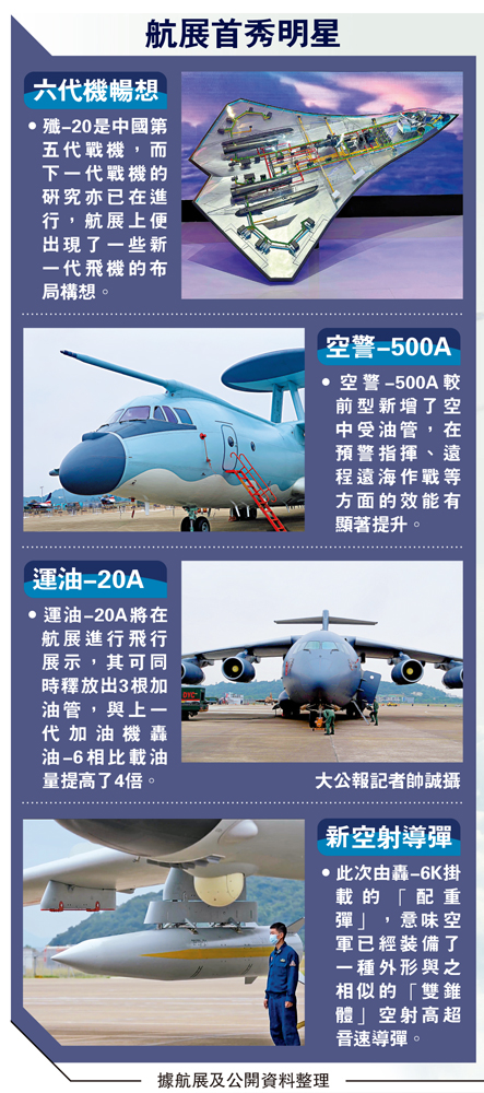 【大公報記者 盧靜怡、帥誠、方俊明、黃寶儀報道】第十四屆中國航展(下稱「珠海航展」)8日將於珠海揭幕。中國空軍以「威龍」殲-20、運-20、運油-20等為代表的「20家族」現役裝備將悉數亮相。大公報記者6日率先探營發現,部分「20家族」成員已在靜態展示區列陣,多型飛機亦進行檢驗性飛行訓練。空軍新聞發言人申進科大校6日公布,空軍投入新時代練兵備戰的50型武器裝備集中參展。航展上,翼龍-1E無人機將以最大掛彈進行首次飛行展示,「戰神」轟-6K則掛載「神秘導彈」登場。