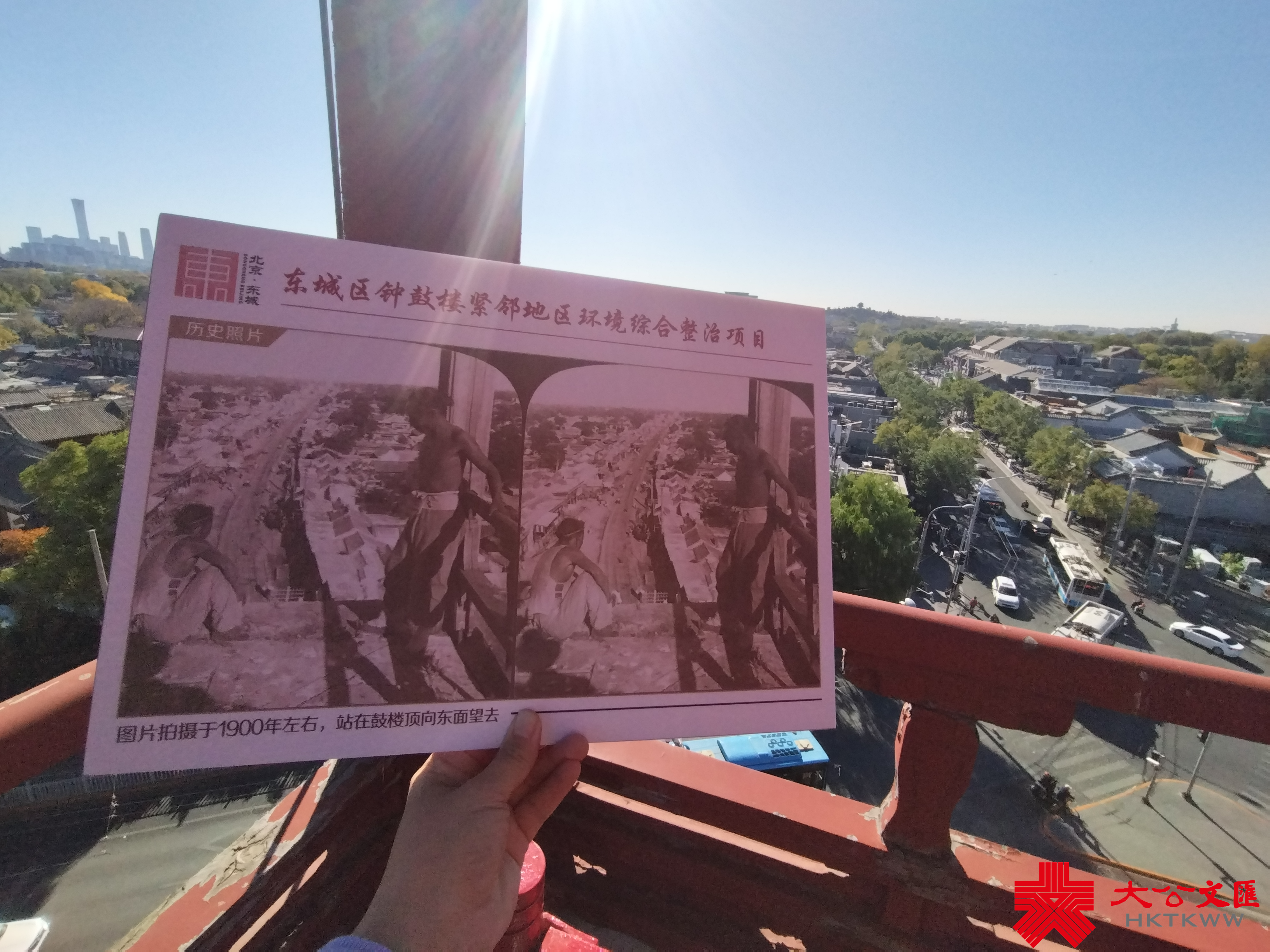 「鬧街靜巷,鼓韻共賞」,秋日暖陽正好,鼓樓廣場上滿是踢毽子、舞紅綢的市民。步入鼓樓,在隆隆鼓聲中拾級上至頂樓俯瞰南望,北京中軸線北端盡收眼底。中規院(北京)規劃設計有限公司建築設計所建築師魯坤介紹,設計團隊查閱了大量的歷史資料,從各方找到了珍貴的1901年和1903年左右的鼓樓至東直門大街、1915年鼓樓東望、1955年鼓樓南望歷史老照片,基本掌握了當地跨度120年的風貌變化情況。「從中可以看出,一直以來北中軸線鐘鼓樓周邊保留了平緩開闊的天際線,延續了以胡同-四合院合瓦屋面為主題的形態特徵,構成了以大片青灰色房屋為基調的整體色彩。」