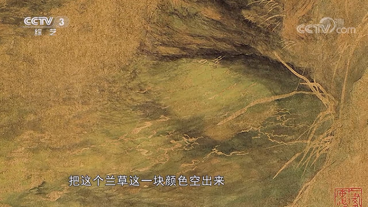 藝術家曹俊:這件作品實際上是我的「新宋式」的代表作,因為這件作品裏邊所呈現出來的狀態是我把我在大自然當中得到的感受進行了我的繪畫表達。譬如說這一塊,我用減法,把蘭草這一塊的顏色空出來,空出來了,就現代了。但是西畫裏面會有這樣的東西,把一片色彩畫出來,然後把顏色刮掉,留出那個樹枝,懷斯就畫過這樣的東西,我是看到他們那些藝術家給我的一些啟迪。
