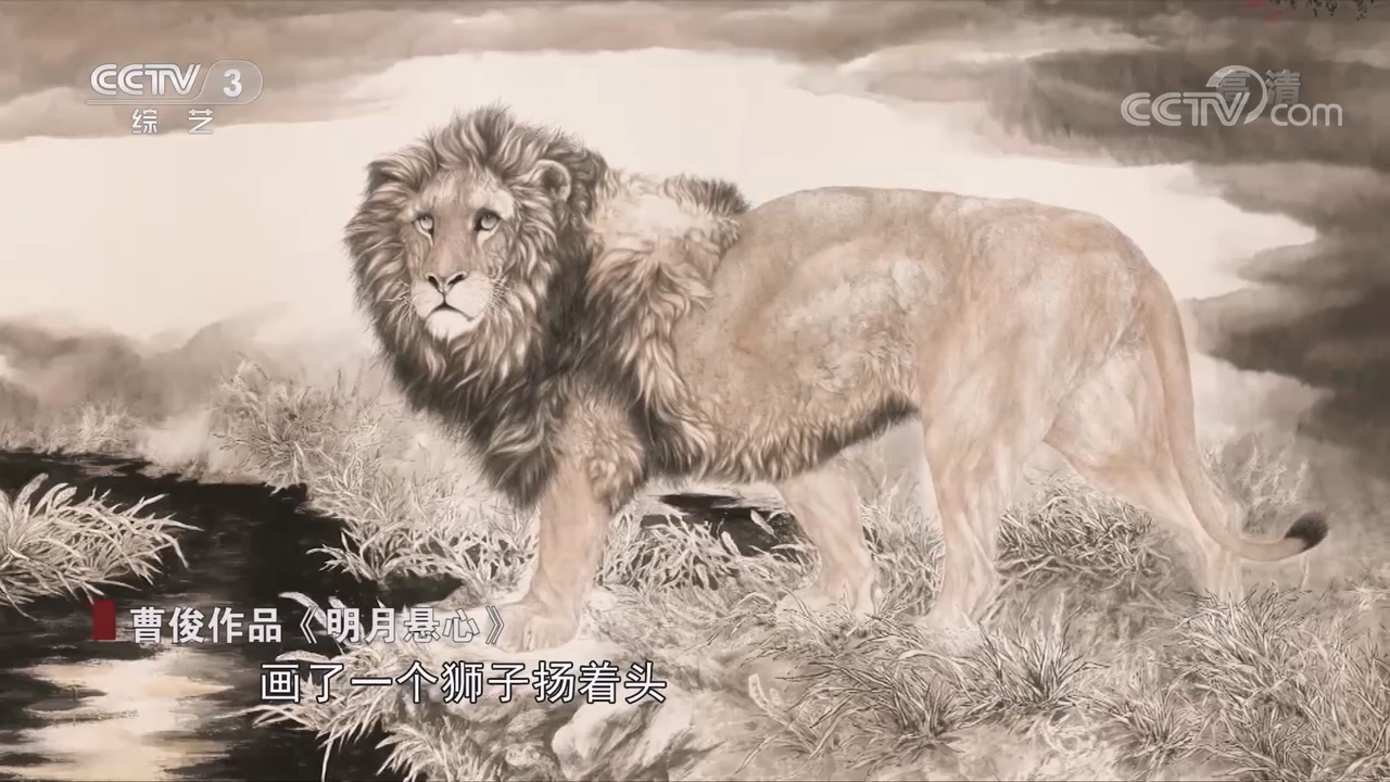 藝術家曹俊:有一件作品叫做《明月懸心》,畫了一個獅子揚着頭,看着天,天上的月亮,然後它腳底下是沼澤地,隨時有可能跌進去。他們居然完全看得懂,完全知道我在說什麼,他們就是都覺得我作品裏面有那樣的靈魂,有那種對未來的、對美好的那種期許。
