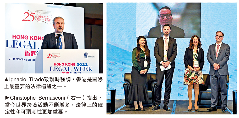 Ignacio Tirado為法律周活動致開幕辭。他稱讚香港是國際上最重要的法律樞紐之一。他說,香港在他心中有重要位置,三年後重新來港出席活動,很高興戰勝了疫情的挑戰,重新回歸正常生活。