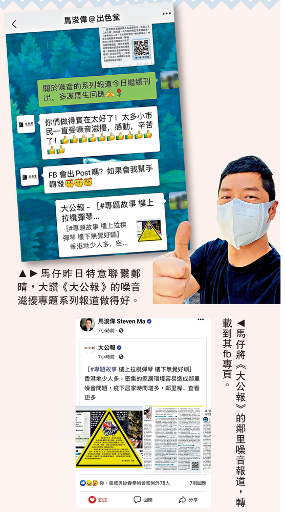 大家咪見馬仔而家精神飽滿,就以為佢食得好、瞓得好,原來佢過去曾被鄰里製造噪音滋擾,搞到無覺好瞓。所以曾經「感同身受」的馬仔看到《大公報》昨日刊出的鄰里噪音報道,即轉載到其fb專頁,粉絲均熱烈討論,網民Fion Chow呼籲政府當局正視問題,「無覺好瞓,好慘㗎,屋企人要搬幾次屋去避噪音」。馬仔亦特意向鄭晴大讚《大公報》做得好,「你們做得實在太好了!太多小市民一直受噪音滋擾,感動,辛苦了!」