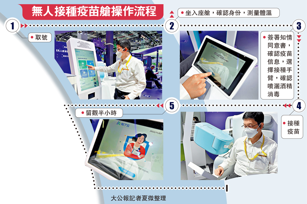 (大公報 記者 夏微)坐進如按摩椅般舒適的座艙,只需片刻,就能準確接種所需疫苗,全程自助,高效便捷……在第五屆中國國際進口博覽會上,有醫藥公司推出了第二代智慧無人疫苗接種艙,接種流程最快可在35秒左右。工作人員介紹,在整個疫苗的存儲和運輸上,實現了全自動的冷鏈監測,全環境的標準冷鏈存儲,此外,這款接種艙的接種準確率超99%,比人工更高。