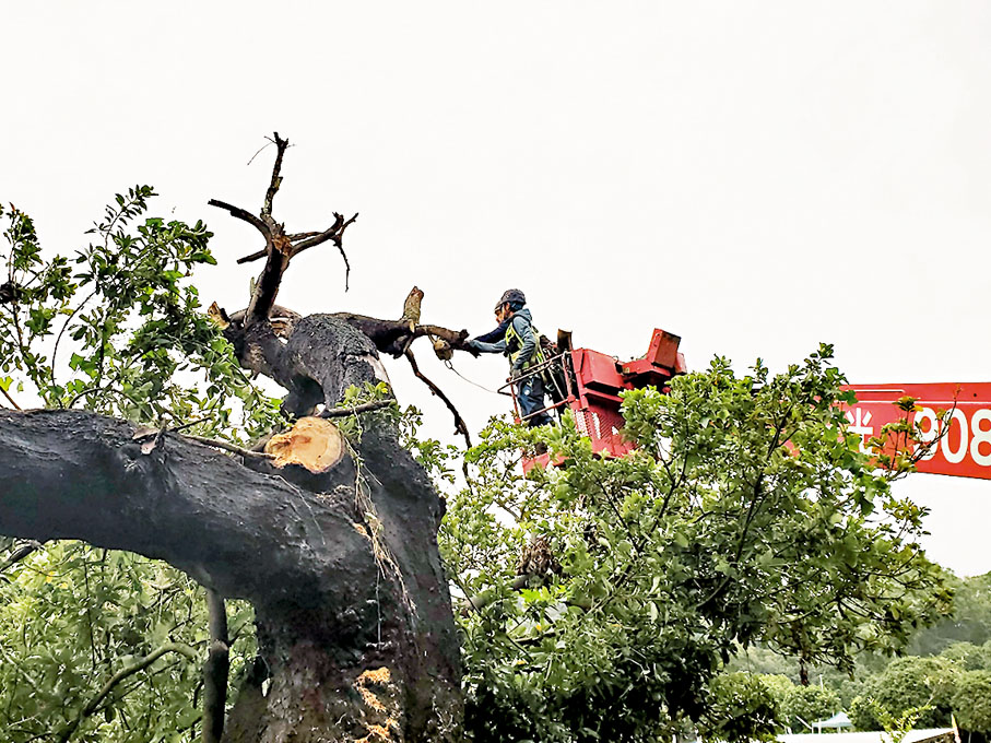 (香港文匯報記者 文禮願)民生無小事,困擾元朗流浮山下白泥村村民兩年的危樹問題日前經香港文匯報介入報道後,香港特區政府部門快速「拆彈」。該樹樹幹直徑估計1米,重約3噸,昨日康文署派出一行七人的樹木隊到現場視察,全程要小心翼翼衡量樹椏及樹身的承載力,先除走樹頂幼枝再一級一級往下鋸,由於危樹位處馬路旁,警方一度派員封路,其間有救護車及村民要求緊急通過,警員快速開路再封路,花近3小時將已乾枯的危樹移除。每日在樹下提心吊膽作業的魚場負責人波叔如釋重負說: 「以後出入唔使再擔驚受怕!多謝曬!」有村民代表建議,政府增撥資源予鄉郊,由村代表聘請專業人士定期修樹、斬樹,效率更高。