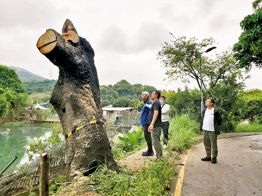 深受危樹影響的魚場負責人波叔也到場見證斬樹,語帶激動說:「我向政府部門投訴了兩年都無人理,多謝你哋(香港文匯報)為民發聲!」波叔直言該樹的樹齡約60年,兩個多月前因枯萎情況嚴重,樹頂部分曾突然塌下,把魚場內價值3,000多元的增氧機壓毀,另外一部分樹椏倒在馬路,幸好未有傷及途人。