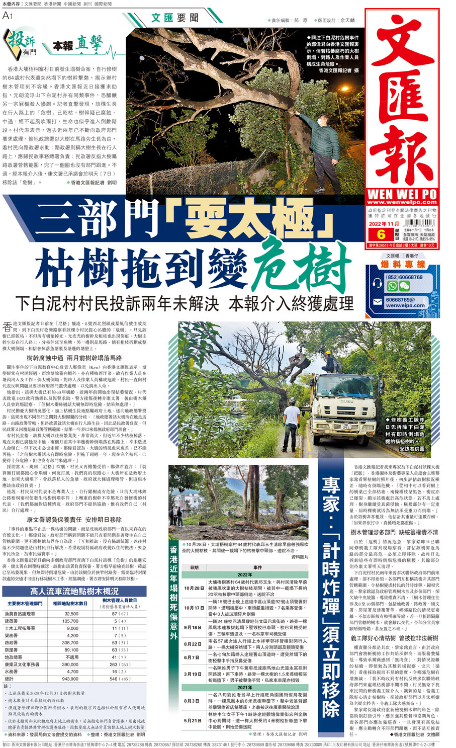 一棵鄉郊枯樹,地政署、路政署及康文署各自為政,拖延兩年期間枯樹漸變危樹。針對有關問題,香港園林及樹藝專業人員總會主席黎家銘昨日向香港文匯報表示,事件主因是政府部門溝通不足,「村民發現棵樹有危險時,只想盡快解決,不會懂得深究這個部門跟那個部門有何分別,今次明顯是政府內部協調不足才導致處理延誤。」他認為,樹木管理辦事處旨在盡快處理有問題樹木,但執行起來往往需要相關部門配合,故希望政府重新檢視「樹木辦」的角色,加強其協調功能。除此之外,他建議為投訴個案設跟進期限,「如果在限期前仍未能處理好的個案,有關部門需有詳細解釋,讓村民更了解箇中問題。」
