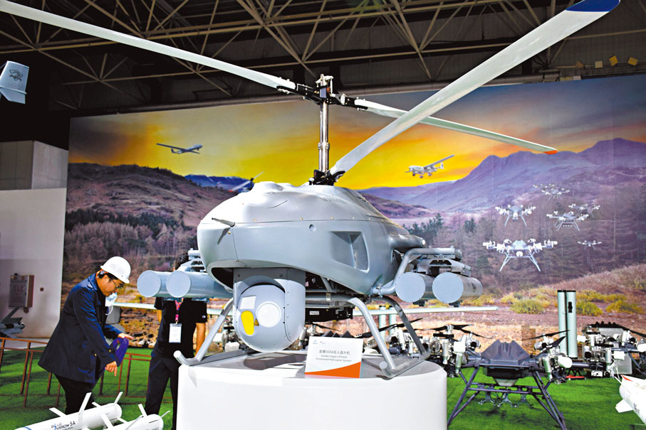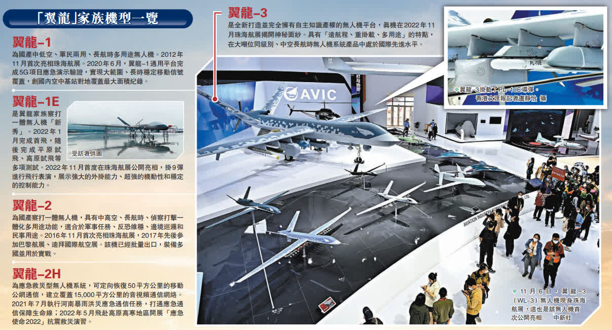 (香港文匯報記者 盧靜怡、帥誠、方俊明、黃寶儀 珠海報道)近年,無人機作戰作為一種新的可以改變戰局態勢的作戰形式登場,也讓各種各樣的無人機在珠海航展上越來越受矚目。在本屆珠海航展,國產無人機全體系化、規模化、系統化地展示出無人機「國家隊」的強大實力。其中,作為高端無人機「國家隊」重要譜系之一的「翼龍」系列全新亮相:翼龍-1E機型將首次參展並掛9彈進行飛行表演;翼龍-3真機掛載PL-10E導彈首度揭開神秘面紗。「PL-10E是中國目前最先進的近距空對空導彈。」相關軍情人士分析說,翼龍-3攜帶該型導彈亮相,顯示該機已具備空戰能力,這在全球同類型無人機中較為罕見。