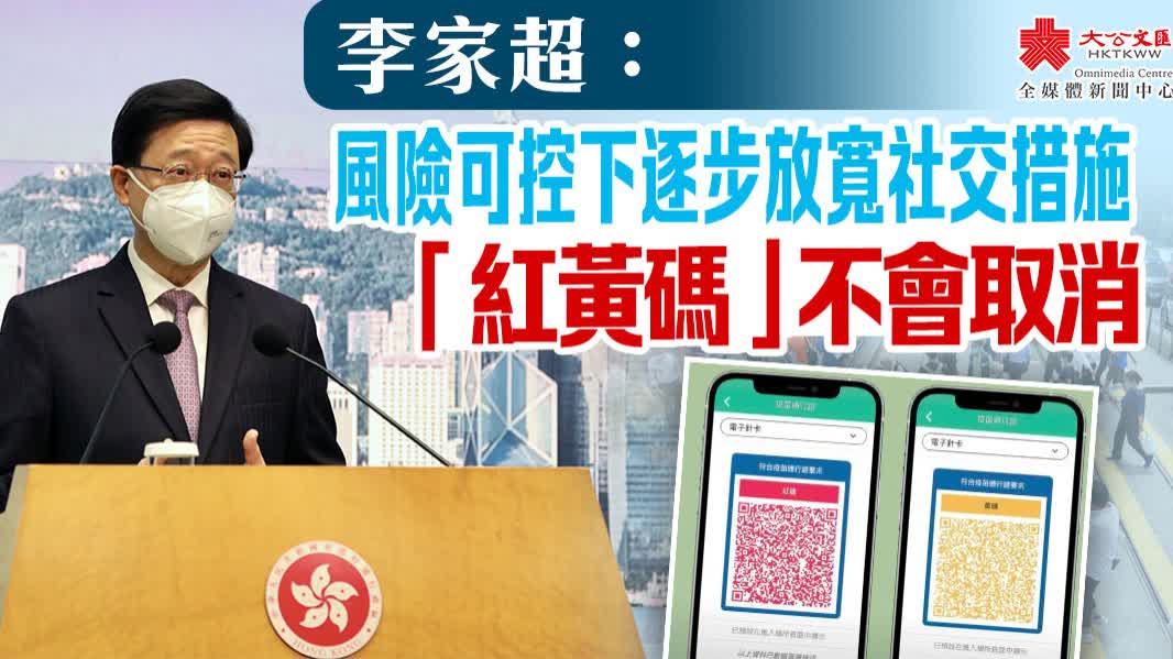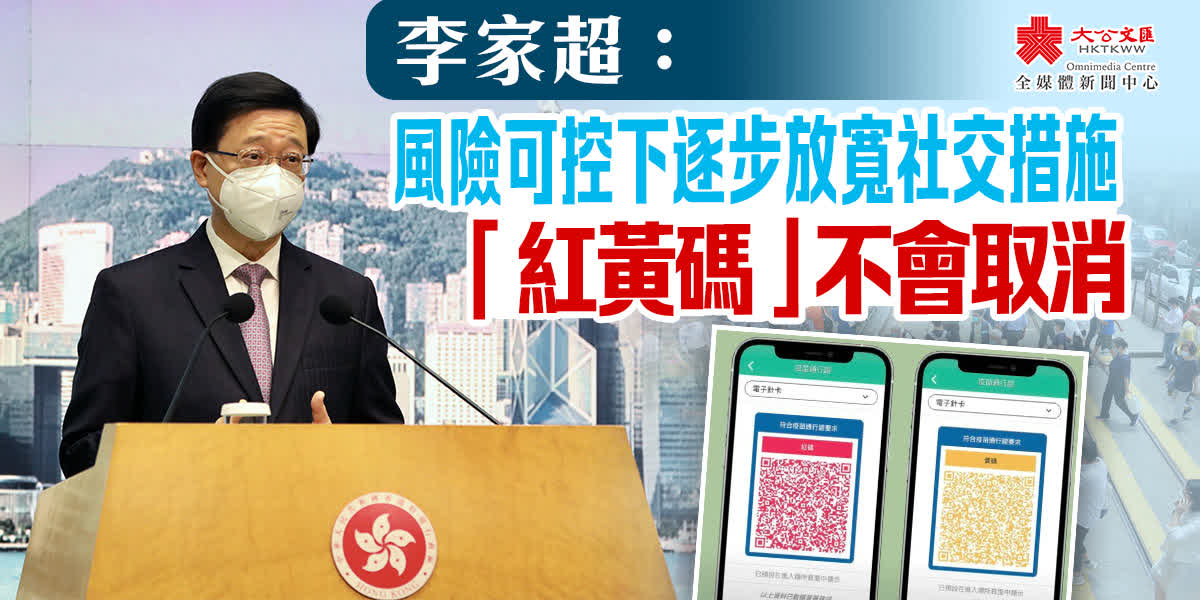 李家超表示,絕對不會取消「紅黃碼」,因為這是風險可控的有效措施,強調疫情未「離開」,「紅黃碼」為按風險管理手段,不會取消。他強調將來總結經驗後,會檢討措施,對外有0+3措施,對內會按風險可控情況下,有序穩妥地逐步解除市民社交距離措施。對於通關方面,他說,兩地未停止過商討,會繼續商討。