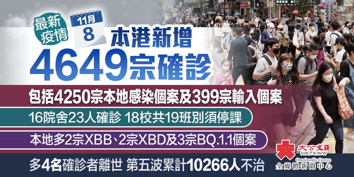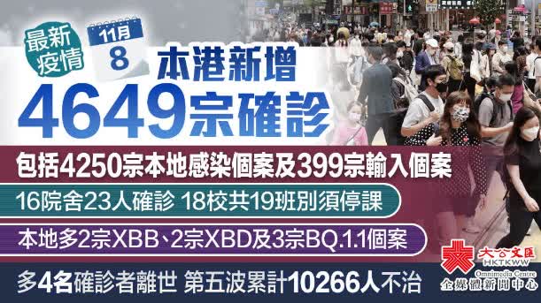 大公文匯全媒體報道,本港第五波疫情持續,衞生署衞生防護中心公布,截至今日(8日)零時,本港過去一日新增4649宗確診個案,包括4250宗本地確診個案及399宗輸入個案。本地確診個案中,核酸檢測陽性個案有948宗,快測陽性個案3302宗。