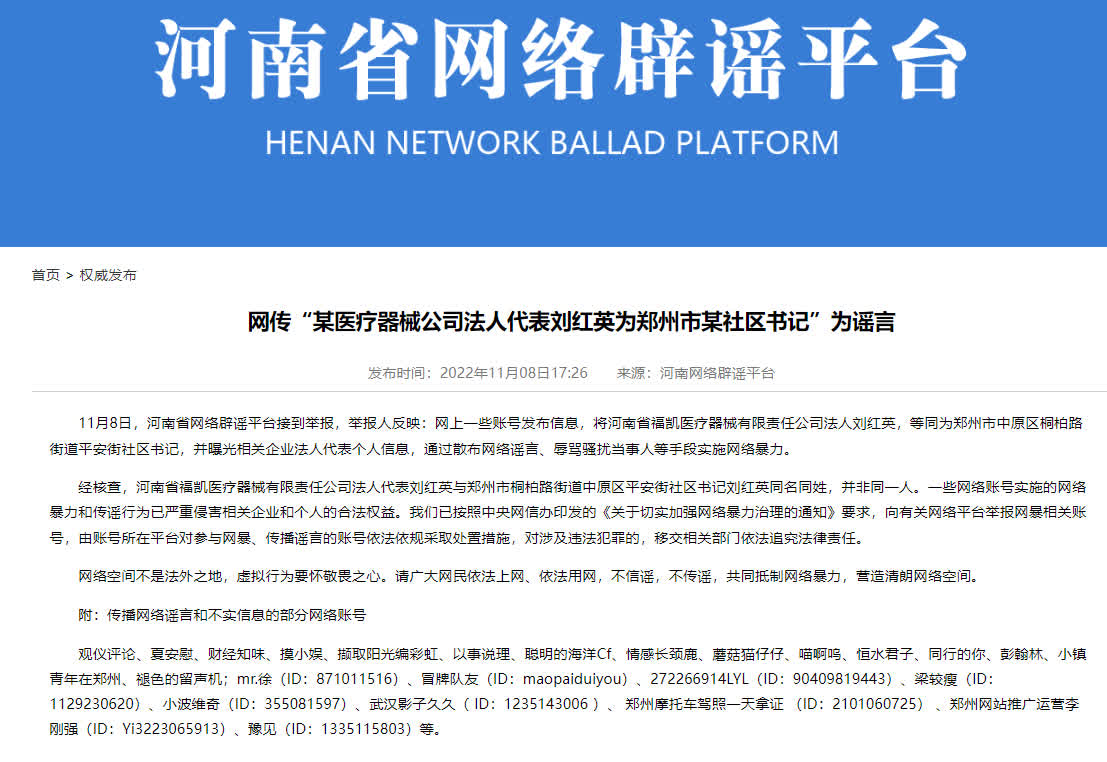 大公文匯網綜合報道,11月8日,河南省網絡闢謠平台接到舉報,舉報人反映:網上一些賬號發布信息,將河南省福凱醫療器械有限責任公司法人劉紅英,等同為鄭州市中原區桐柏路街道平安街社區書記,並曝光相關企業法人代表個人信息,通過散布網絡謠言、辱罵騷擾當事人等手段實施網絡暴力。