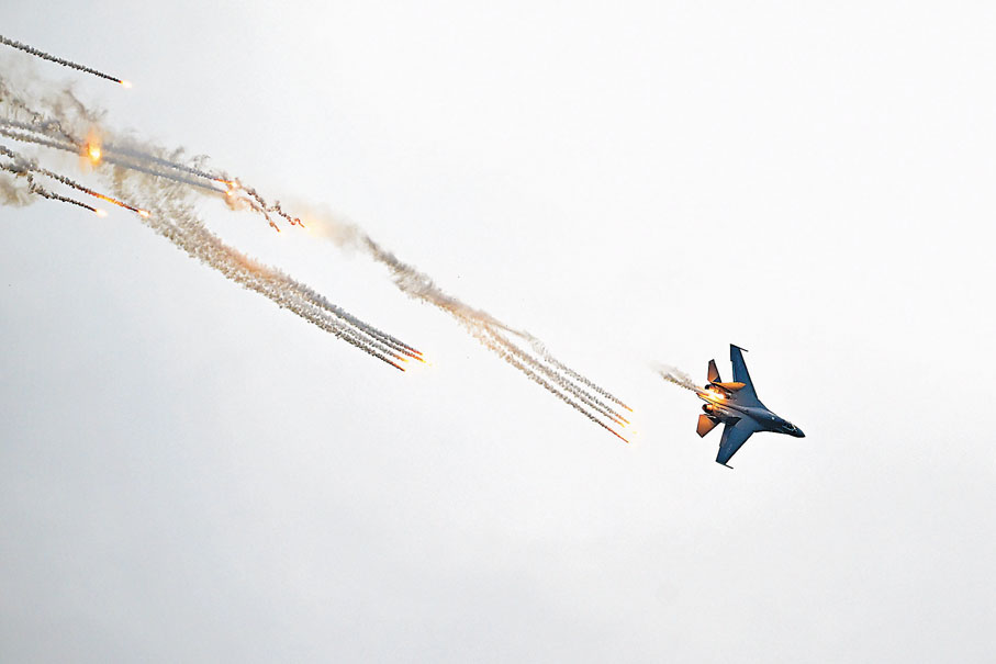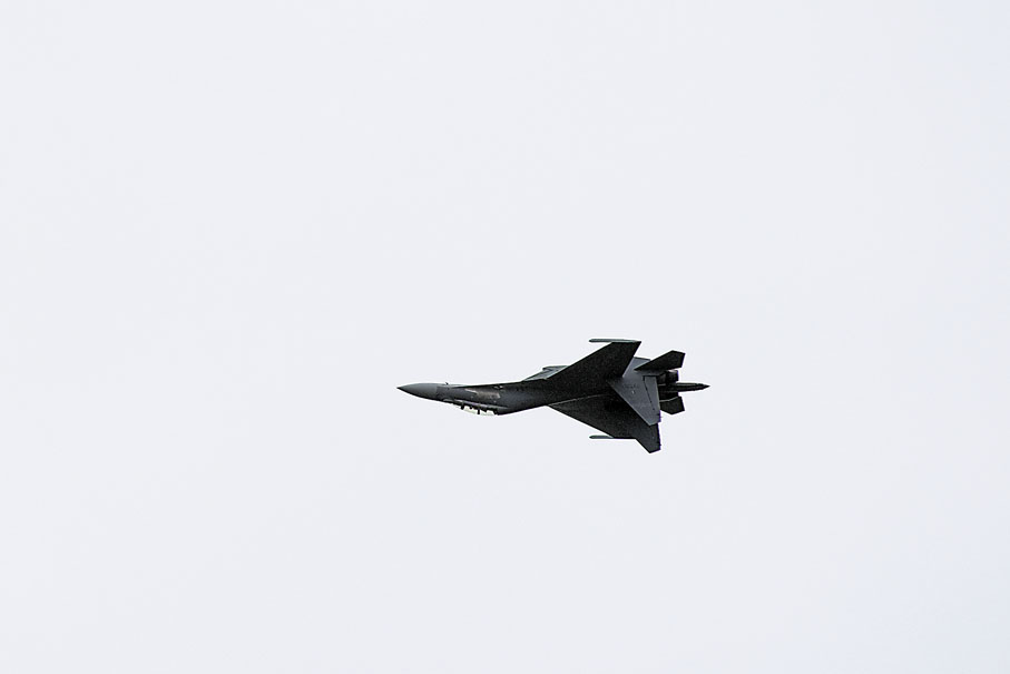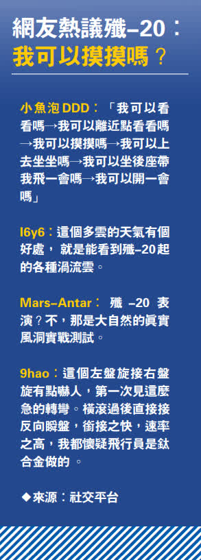 在珠海航展現場,開闊的場地聚攏大批觀眾。為了安全,在飛行跑道外圍上了一層鐵馬,避免激動的觀眾太靠近準備演出的戰機。在殲-20震撼登場後,首秀的殲-16也讓觀眾大呼過癮。殲-16入場不久,便毫不客氣地上演倒飛通場,座艙蓋朝下、機腹朝上,引來地面觀眾連連驚呼。解說員稱,這個動作的容錯率非常低,特別考驗裝備能力和飛行員的操作水平。表演完倒飛後,殲-16拋灑干擾彈呼嘯而過,閃光的干擾彈畫下漂亮的拋物線,宛如一場浪漫的白日流星雨。