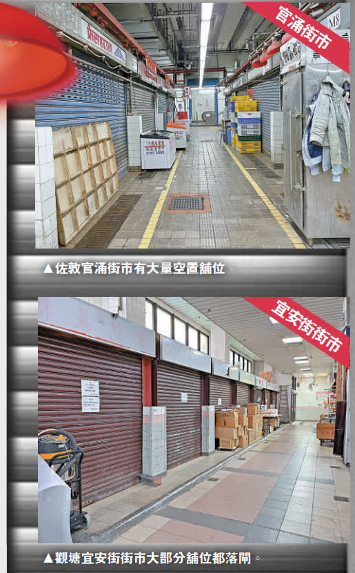 同樣,位於佐敦的官涌街市、觀塘宜安街街市都有大量空置檔位,據食環署2020年底的資料顯示,空置率分別達36%和43%。在官涌街市有不少空置攤檔被食環署拉上圍封膠帶,並貼出告示,稱「本檔位之租用權已交還本署,任何人士不得在此等範圍內擺放物品,違者會遭受檢控或物品被扣押或充公。」街市只餘少量仍堅守陣營的檔主,個個無精打采,前往買餸的市民寥寥可數。