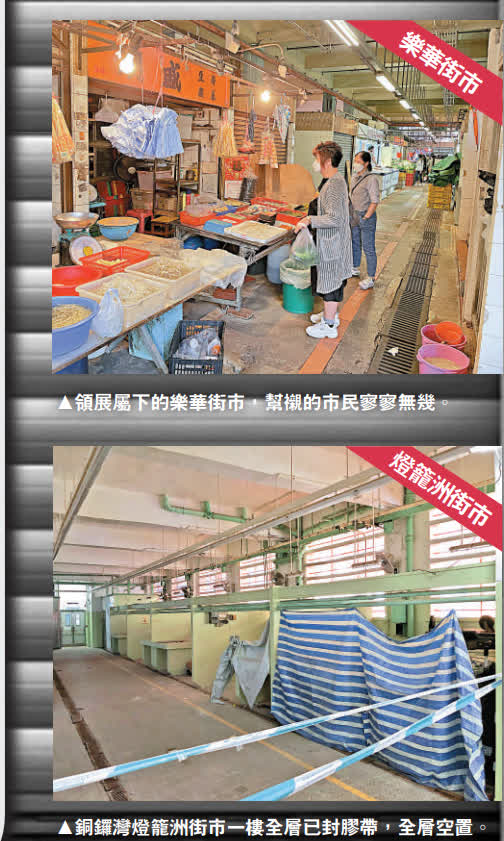 大公報記者翻查食環署資料和親臨港九、新界多區的公眾街市,發現部分街市檔空置率驚人。位於銅鑼灣渣甸街黃金地段的燈籠洲街市,食環署自2010年關閉一樓全層後,十多年來毫無動靜,至今仍處於塵封狀態。位於地下的檔位亦僅有十來個檔位開張,其他的大多成為存貨檔,整個街市毫無人氣,猶如「死場」,死氣沉沉。