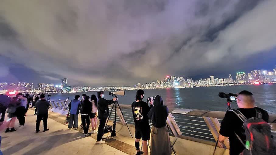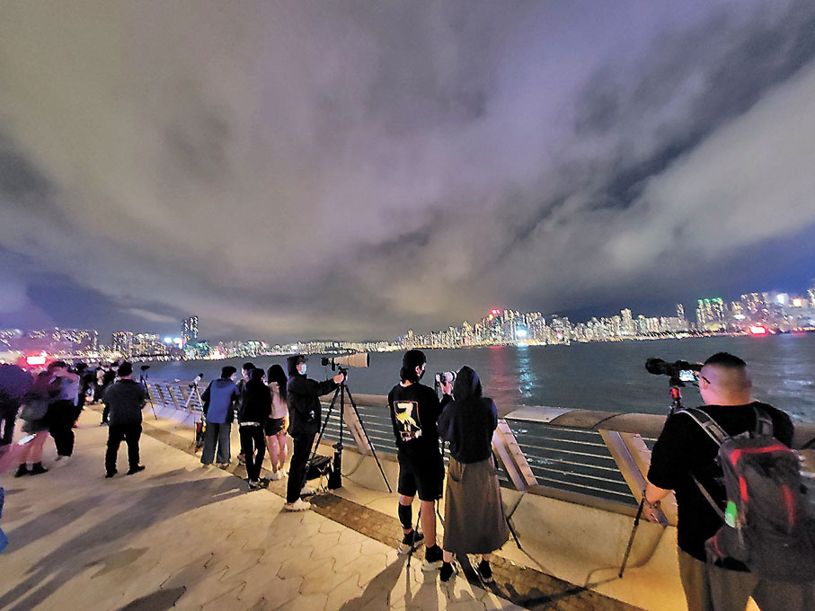 大批市民昨晚駐足尖沙咀星光大道、白石角海濱長廊、中西區海濱長廊等地一睹月全食及月掩天王星的奇景。不少市民帶備相機及望遠鏡,準備捕捉「血月」,但昨晚雲層厚,月全食一時見到,一時又被雲層遮蓋,更不時下着微雨。有天文發燒友更特意請假半天來看月食,他說:「既有血月,又有天王星與月球連成一線,一生人可能只此一次有機會看到,所以過來看。」