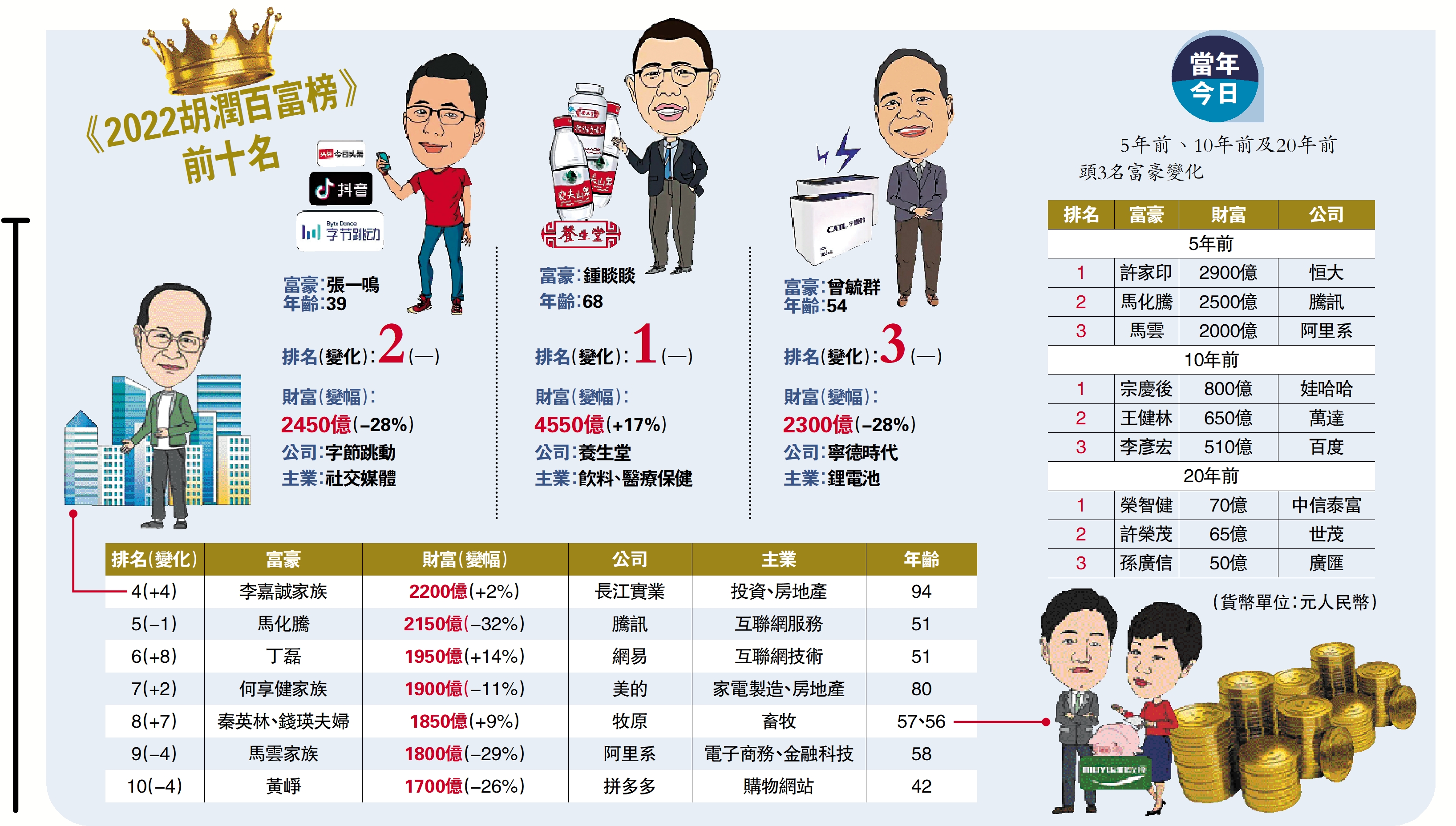 (大公報記者 彭巧容)2022年胡潤百富榜昨日發布。農夫山泉董事長鍾睒睒以4550億元(人民幣,下同)身家蟬聯榜單冠軍;緊隨其後的是字節跳動的張一鳴和寧德時代的曾毓群,兩人的身家分別達到2450億及2300億元。今年前3位排名與去年沒有變化,但在全球經濟放緩下,張一鳴及曾毓群身家均下降28%。同時,今年上榜的富豪人數及富豪總身家較去年錄雙位數下跌。此外,今年傳統行業上升明顯,大多數上榜企業家主要在內地市場創造財富。