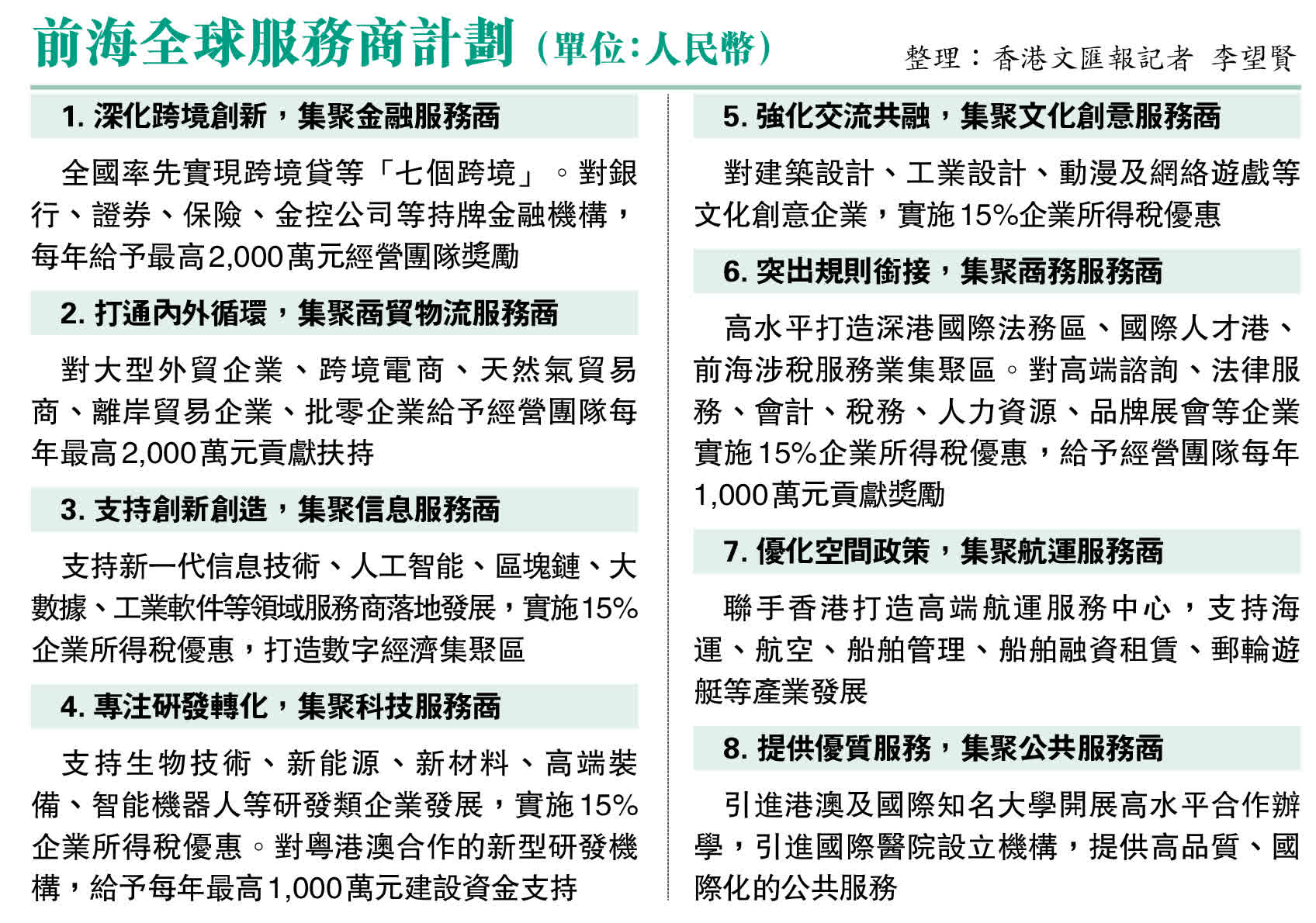 (香港文匯報記者 李望賢 深圳報道)前海重磅發布「全球服務商計劃」,積極招引培育細分領域全球前50、國內前20的現代金融、商貿物流、信息服務等八大領域服務商。前海方面表示,將依託稅率優惠政策,實現「1231」發展目標,即通過每年提供產業扶持資金不少於10億元(人民幣,下同),產業空間不少於20萬平方米,到2025年引進、培育全球服務商300家以上,實現服務業增加值1,000億元以上,全力打造大灣區現代服務業發展核心引擎,建設亞太地區重要的生產性服務業中心。