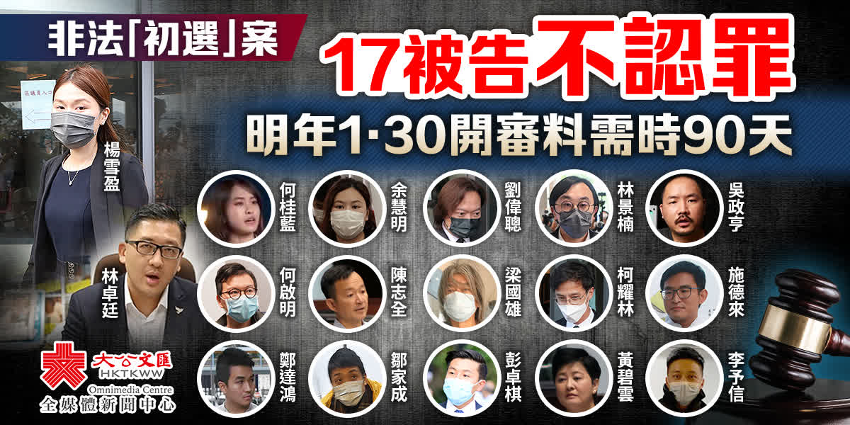 17名不認罪的被告包括:鄭達鴻、楊雪盈、彭卓棋、何啟明、劉偉聰、黃碧雲、施德來、何桂藍、陳志全、鄒家成、林卓廷、梁國雄、林景楠、柯耀林、李予信、余慧明及吳政亨。控罪指各被告於2020年7月1日至2021年1月7日期間,串謀他人旨在顛覆國家政權。