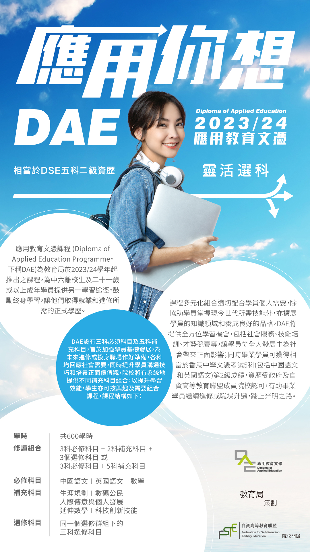 大公文匯全媒體報道,施政報告提出,由2023/24學年起,推出應用教育文憑課程,以取代現有的毅進文憑課程。自資高等教育聯盟今日(9日)宣布,8間院校將於下學年開辦應用教育文憑課程(DAE),畢業生相等於中學文憑試5科2級成績。課程招生由12月5日起開始,至明年7月17日結束,學生可到聯盟網站報名。