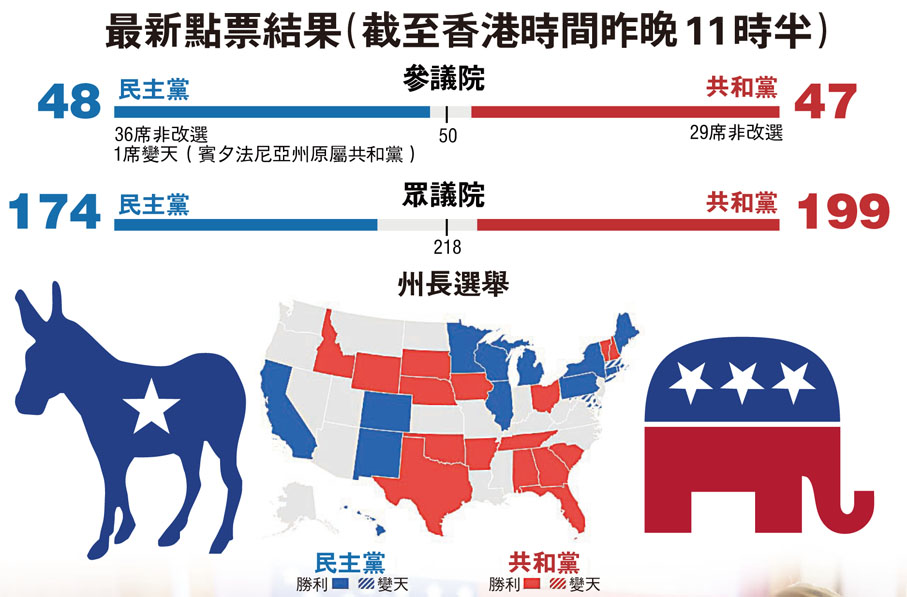 截至香港時間昨晚11時半,參院改選的35席中已有30席公布結果,連同無需改選的議席,民主黨在全院100席中暫取得48席,領先共和黨的47席。眾院全數435席均需改選,共和黨以199席對174席暫時領先,只需多取19席便可過半。