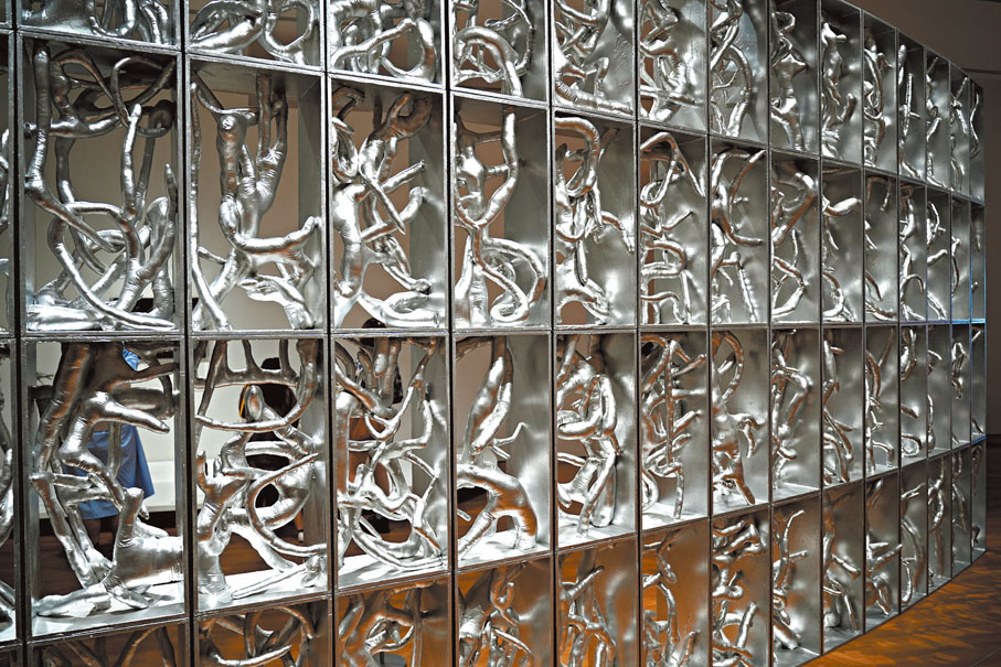 面對死亡,草間彌生並不畏懼,藝術創作讓她排解對死亡的執迷,奮力戰勝抑鬱。她毫不避諱這些陰暗感受,以藝術坦誠地傳遞生存意志,帶來感染人心的訊息。《囚徒之門》是她於1994年創作的作品,巨型牆狀結構,流露她感受到的疏離和束縛,繁茂蔓生的銀色枝條攀滿門框。雖然作品的感覺像樊籠,但活力煥發的生長狀態也象徵生機,以及她決心破除面前障礙的鬥志。