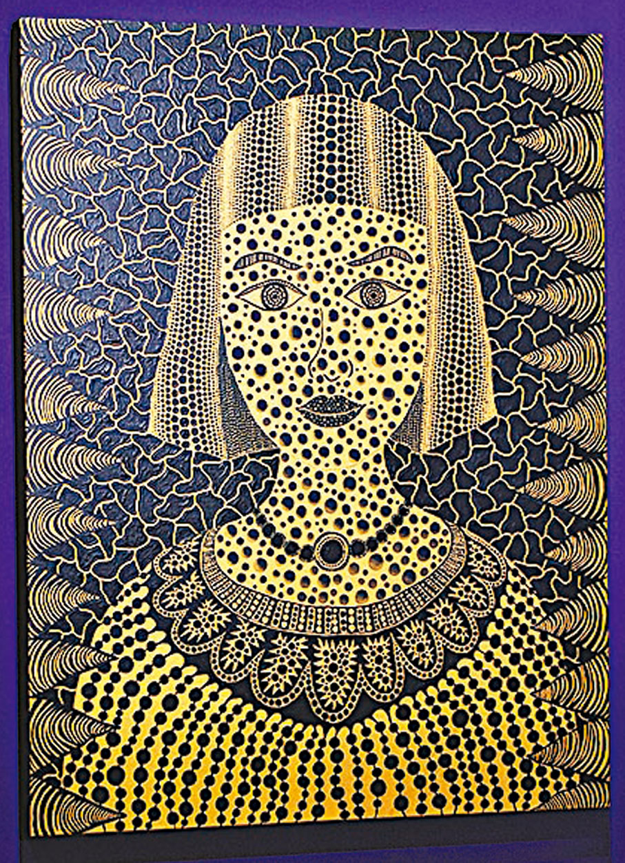 甫走入展覽,一幅自畫像牆映入眼簾,展示了十多幅草間彌生的自畫像,這些畫作橫跨1950至2020年,從中可見草間彌生作為創作題材的過人魅力。