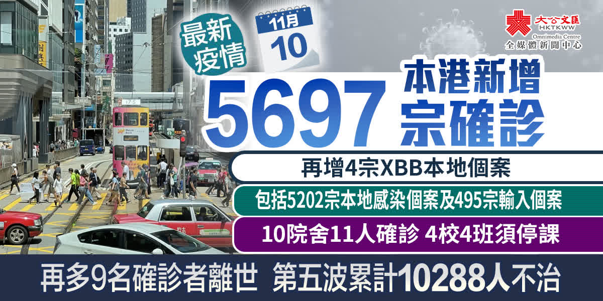 大公文匯全媒體報道,本港第五波疫情持續,衞生署衞生防護中心公布,截至今日(10日)零時,本港過去一日新增5697宗確診個案,包括5202宗本地確診個案及495宗輸入個案。本地確診個案中,核酸檢測陽性個案有1185宗,快測陽性個案4017宗。
