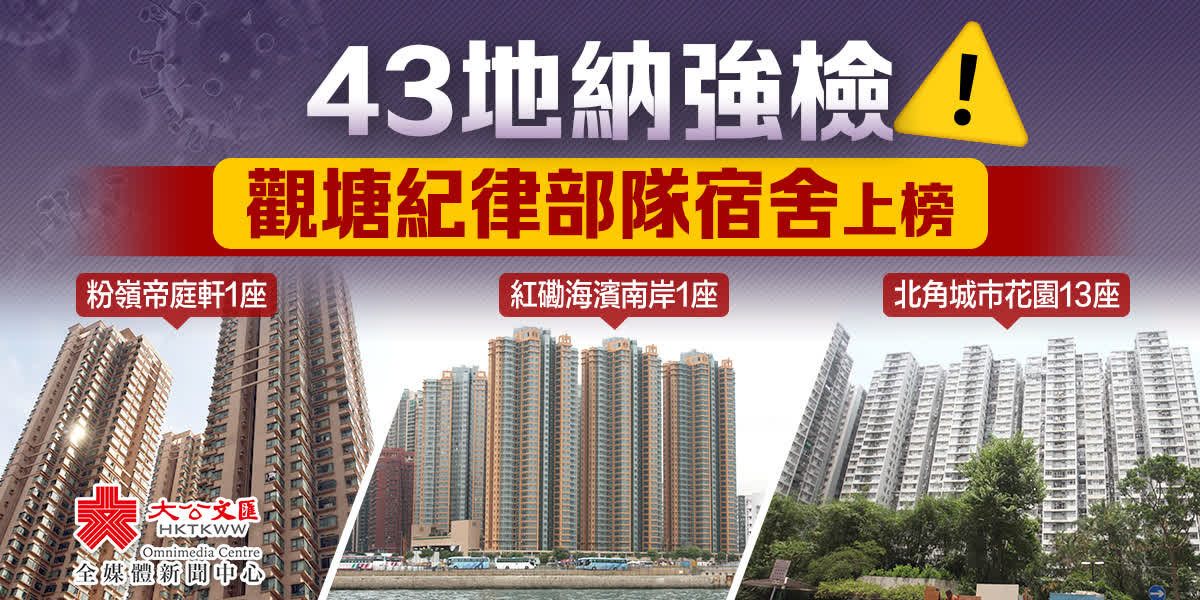 大公文匯全媒體報道,本港第五波疫情持續,衞生署衞生防護中心公布,截至今日(10日)零時,本港過去一日新增5697宗確診個案,包括5202宗本地確診個案及495宗輸入個案。政府今晚發出強制檢測公告,要求於指定期間曾身處以下43個指明地方的人士,須在11月11日及12日接受核酸檢測。