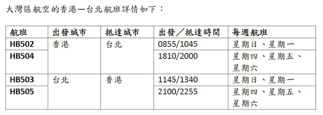 據悉,新航線逢星期四至星期一提供服務,分別是早上與傍晚出發的航班,香港早機於早上8時55分出發,11時45分於台北回港;傍晚方面,將於6時10分由香港出發,晚上9時回港,飛行時間大約為兩小時。