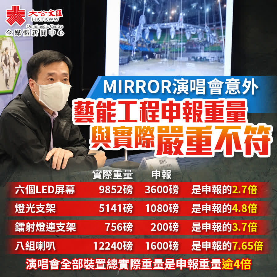 鐘雅倫指出,演唱會中使用的六個LED熒幕實際重量達9852磅,而藝能申報重量為3600磅,實際重量是申報重量的2.7倍;燈光支架裝置實際重量為5141磅,而申報重量為1080磅,實際重量是申報重量的4.8倍;鐳射燈連支架的實際重量是756磅,而申報重量為200磅,實際重量是申報重量的3.7倍;8組喇叭實際重量為12240磅,申報重量為1600磅,實際重量是申報重量逾7倍。他指出,演唱會中使用的所有裝置的總實際重量是申報重量逾4倍。