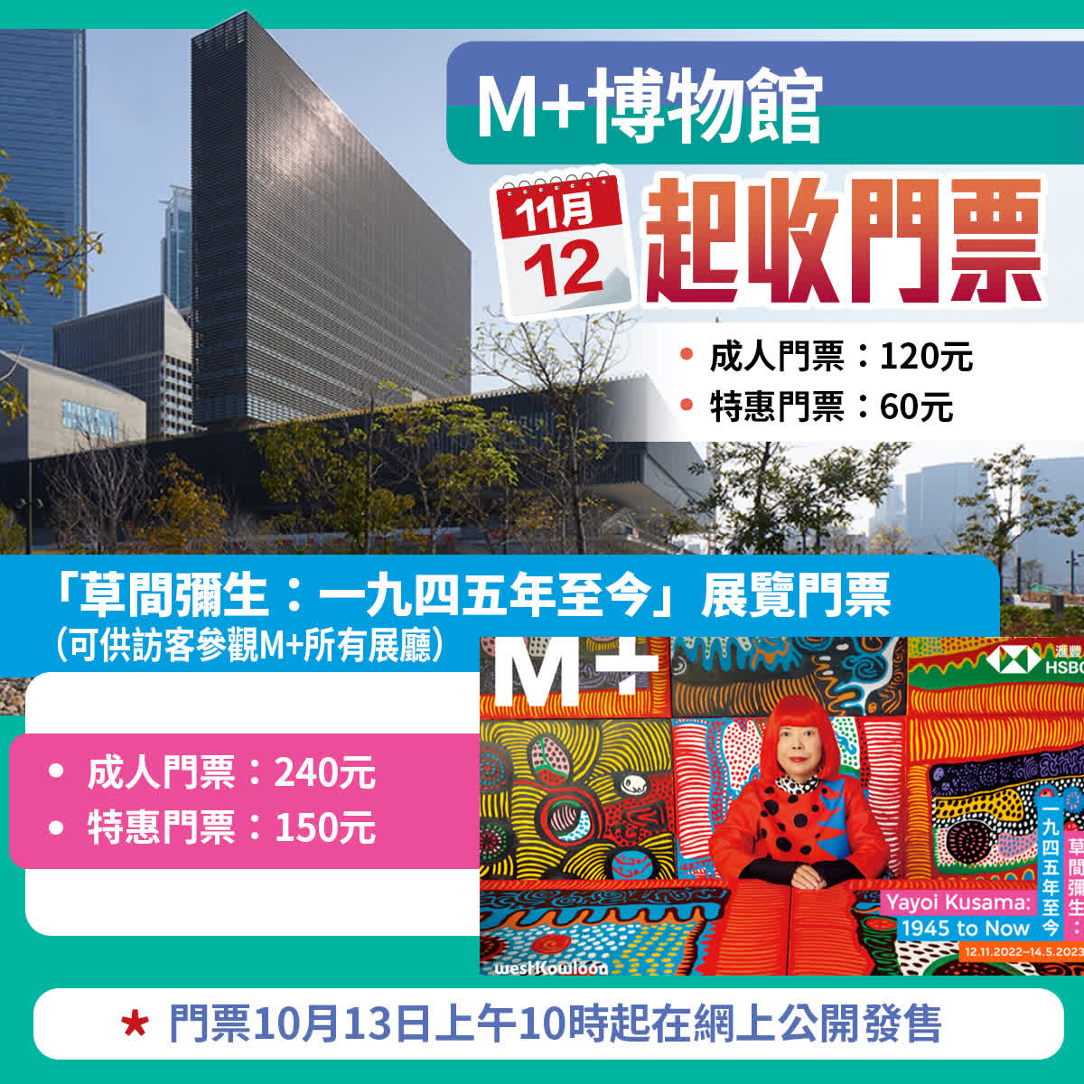 此外,M+博物館明日起將展出日本藝術家草間彌生的多項作品,包括繪畫、裝置、雕塑、流動影像等。展出門票240元,全日制學生、60歲以上長者等票價為150元,持票市民可參觀M+其他展廳。
