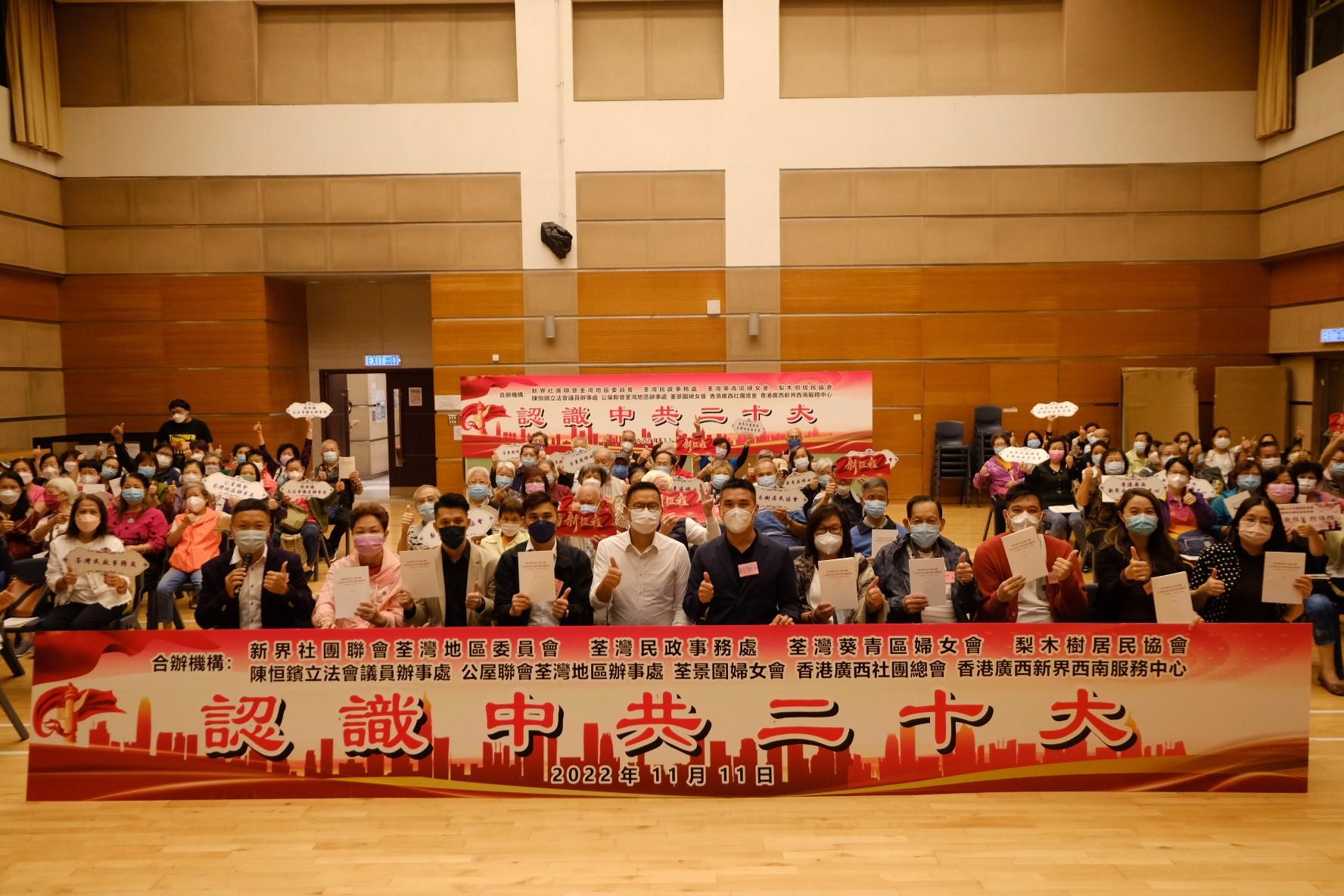 荃灣民政事務處今日(11日)聯同新社聯荃灣地區委員會、荃灣葵青區婦女會、梨木樹居民協會、公屋聯會荃灣地區辦事處、荃景圍婦女會和香港廣西社團總會新界西南服務中心等團體,在梨木樹社區會堂舉辦「認識中共二十大」座談會,邀請立法會議員陳恒鑌為主講嘉賓,分享二十大報告的要點。約220人出席座談會,與會者包括地區團體代表及會員。