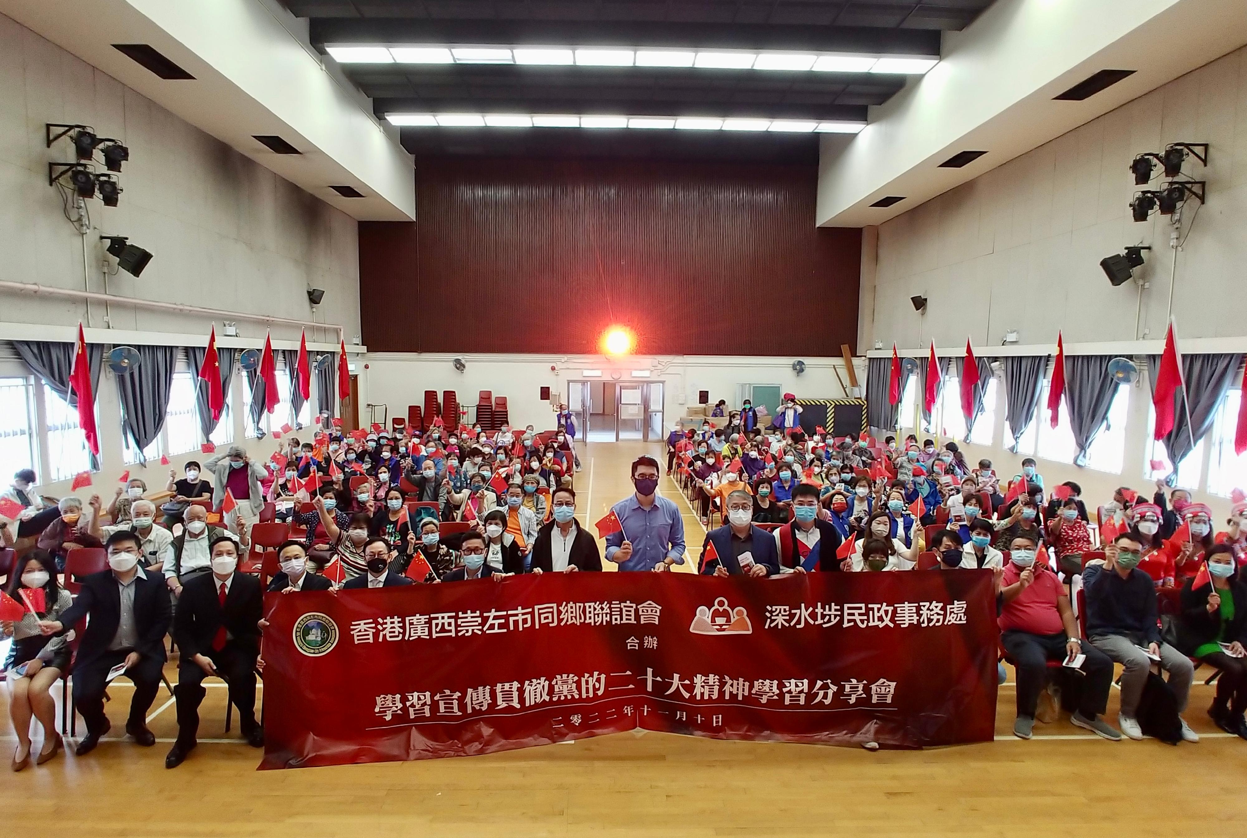 繼在10月30日舉辦座談會後,深水埗民政事務處昨日(10日)聯同香港廣西社團總會及香港廣西九龍西服務中心,在長沙灣社區中心禮堂舉辦「學習宣傳貫徹黨的二十大精神學習分享會」,邀請港區全國人大代表李君豪為主講嘉賓。他扼要指出習近平總書記在二十大開幕報告的重點,闡明實現第二個百年奮鬥目標的內涵,以及中央全力支持香港更好融入國家發展大局等要點。約200人出席座談會,與會者包括深水埗地區團體領袖及街坊。