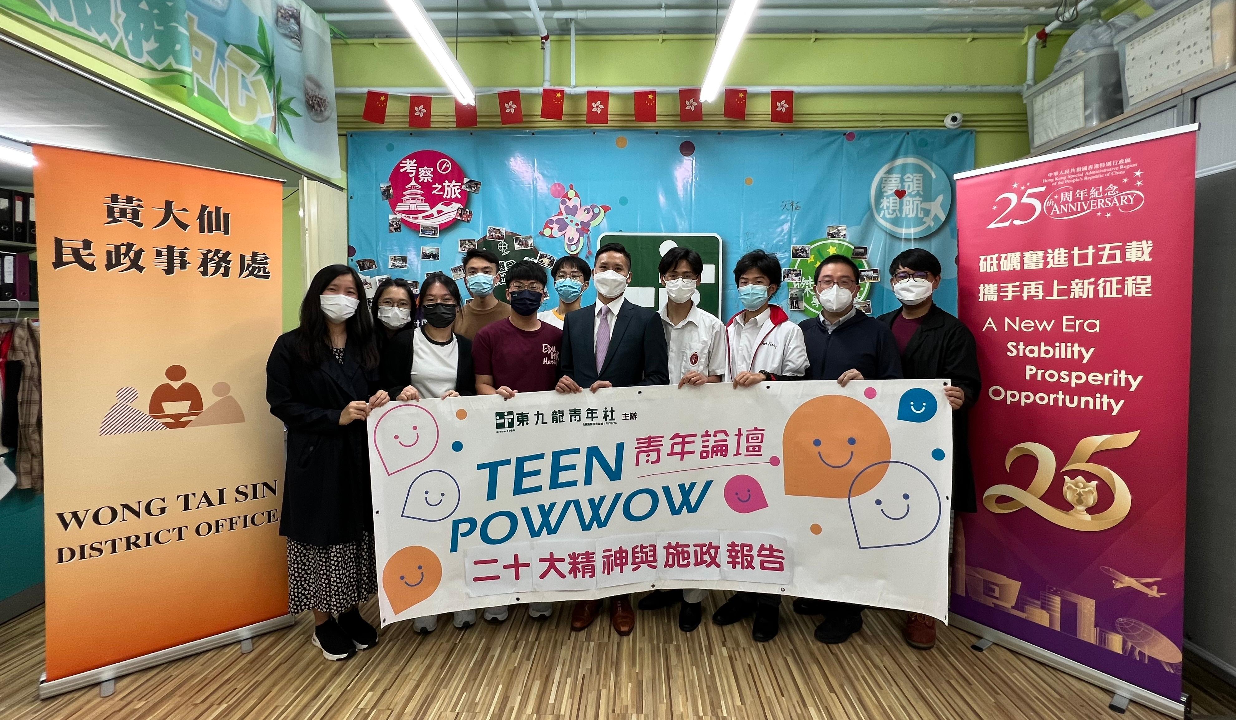 繼10月23日、25日、26日、27日、29日、11月3日分別舉辦6場座談會後,黃大仙民政事務處昨日(10日)聯同東九龍青年社,在東九龍青年社會址舉辦「TeenPowwow 青年論壇──二十大精神與施政報告」座談會,邀請東九龍青年社社監梁騰丰及東九龍居民委員會主席何漢文為主講嘉賓。他們引述習近平總書記在二十大會議中提及「江山就是人民,人民就是江山」,指出黨和國家都是以民為本,為人民福祉努力,期望青年積極參與地區工作,主動為社區發展提出建議。