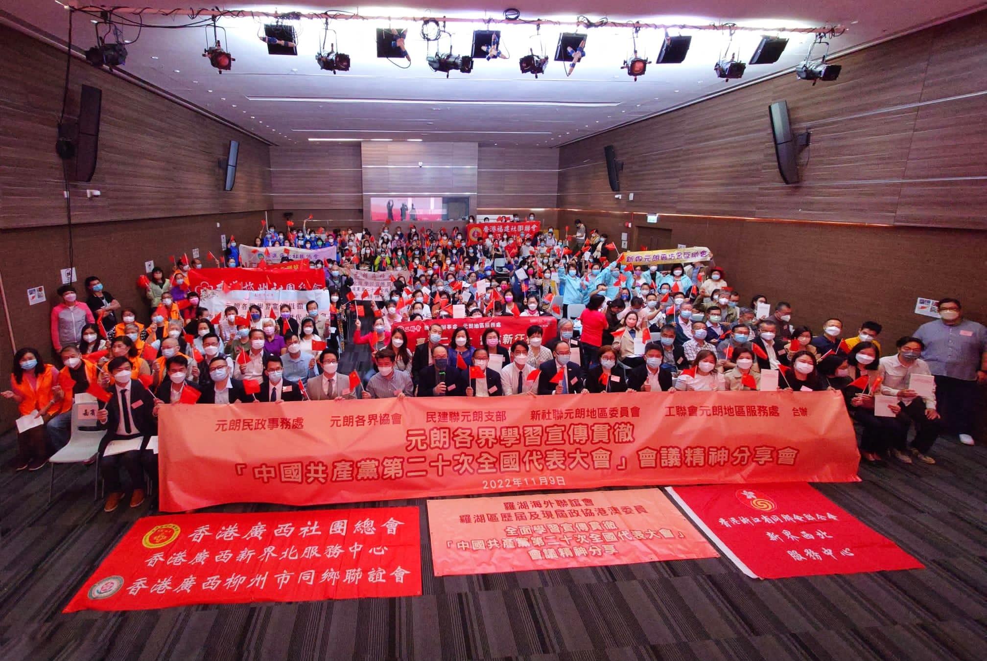 繼11月7日舉辦座談會後,元朗民政事務處於11月9日聯同元朗各界協會、民建聯元朗支部、新社聯元朗地區委員會及工聯會元朗地區服務處,在元朗區綜合服務大樓舉辦「元朗各界學習宣傳貫徹『中國共產黨第二十次全國代表大會』會議精神分享會」,邀請港區全國政協委員及新社聯會長梁志祥、元朗民政事務專員胡天祐及青年發展委員會委員姚國威為主講嘉賓。他們指出二十大報告對「一國兩制」的論述是推動香港走向「由治及興」的重要行動指南;而二十大的召開,標誌着中國正向第二個百年奮鬥目標進軍。約260人出席座談會,與會者包括超過100個地區團體及同鄉社團的代表。