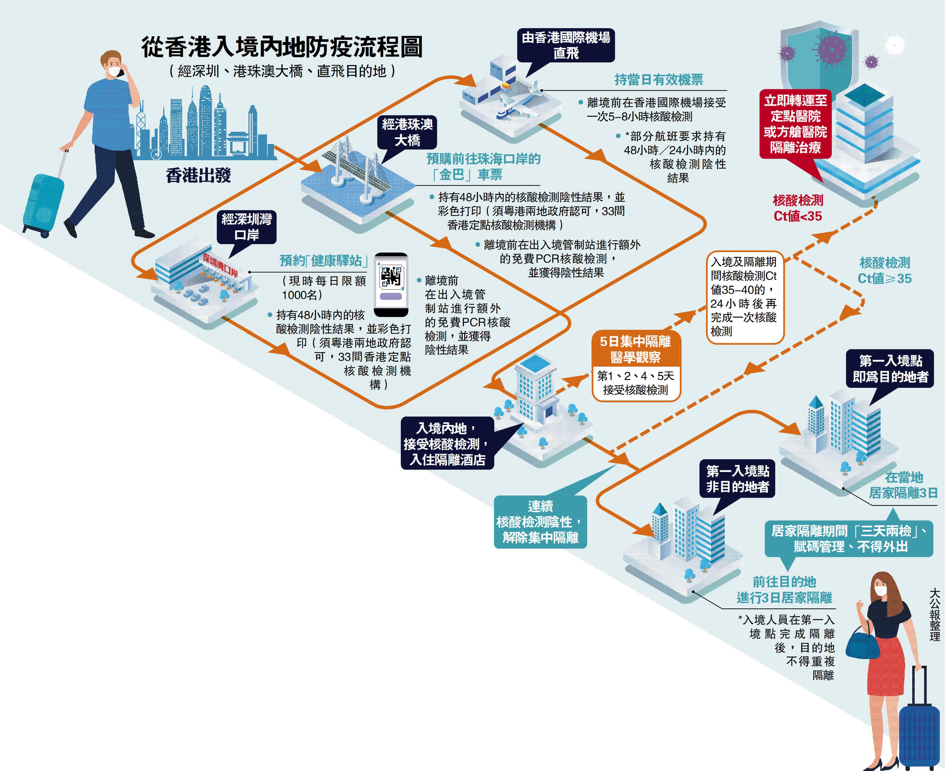 (大公報記者 劉凝哲、伍軒沛)國務院應對新型冠狀病毒肺炎疫情聯防聯控機制綜合組11日發布《關於進一步優化新冠肺炎疫情防控措施科學精準做好防控工作的通知》,對包括入境內地政策在內的疫控措施進行多項重要調整,進一步縮短入境人員的集中隔離時間,將「7天集中隔離+3天居家健康監測」調整為「5天集中隔離+3天居家隔離」,入境人員在第一入境點完成隔離後,目的地不得重複隔離。首次啟動「閉環泡泡」,對入境重要商務人員、體育團組等轉運至免隔離閉環管理區開展活動,同時取消了已實施長達兩年多的航班熔斷機制。有港人興奮表示,對需要往返內地與香港的人來說,新措施「絕對是佳音」,回鄉的路更近了。