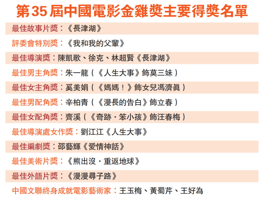 (香港文匯報 記者 蔣煌基 廈門報道)第35屆中國電影金雞獎頒獎典禮昨晚在福建廈門舉行。紅毯儀式及頒獎典禮上群星璀璨。頒獎禮嘉賓陣容包括成龍、劉德華、惠英紅、任達華、陳凱歌、李雪健、吳京、文詠珊等。內地演員朱一龍、奚美娟分別憑藉《人生大事》、《媽媽!》獲得最佳男女主角獎。陳凱歌、徐克、林超賢憑《長津湖》獲得最佳導演獎,同時《長津湖》亦獲得最佳故事片獎。王玉梅、黃蜀芹、王好為獲得中國文聯終身成就電影藝術家榮譽。第35屆中國電影金雞獎評委會特別獎授予《我和我的父輩》。