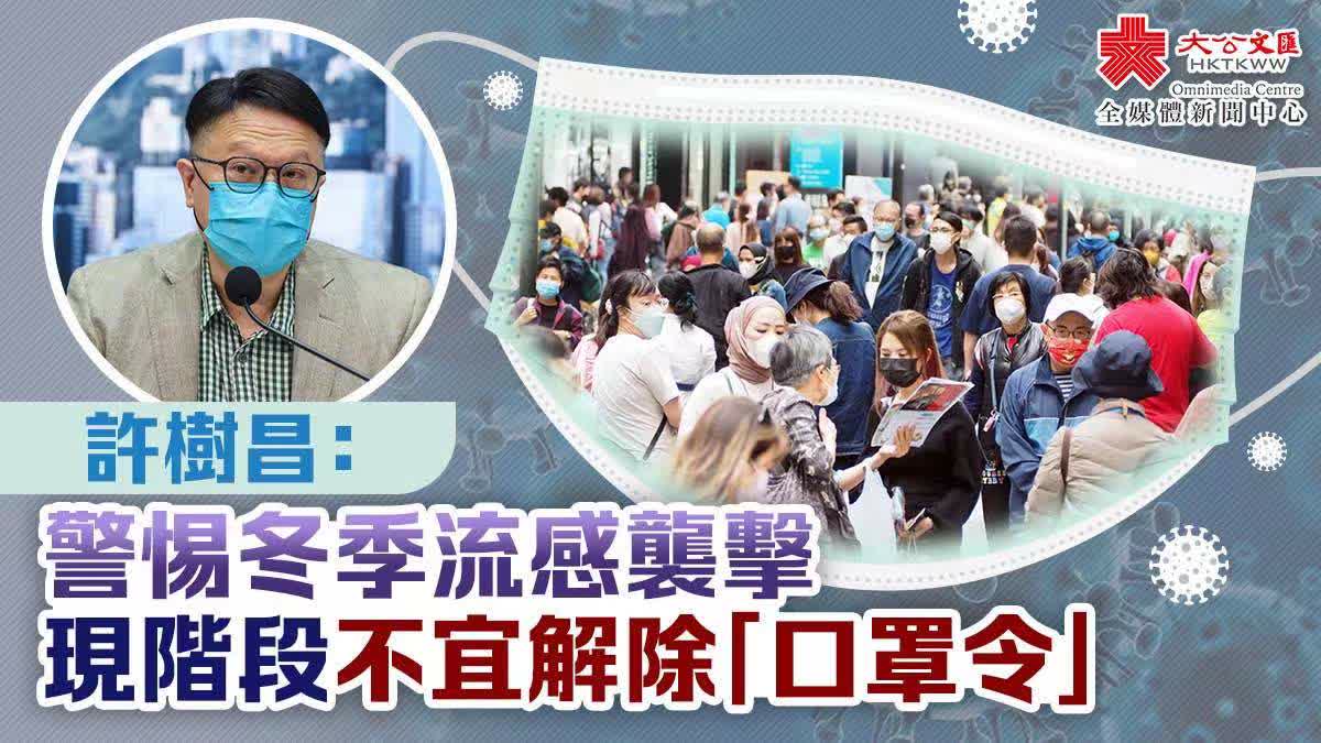 許樹昌指,近兩年由於佩戴口罩情況良好,多種呼吸道疾病因此受控。以澳洲為例,在今年4至8月當地冬季時,由於沒有口罩令,引起季節性流感大爆發,強調香港要小心冬季流感襲擊,現階段並不適宜解除「口罩令」,至少要等冬季過後,才可以考慮是否在戶外地方可不佩戴口罩,但乘搭公共交通工具及身處人多擠逼地方時,都需要佩戴口罩。