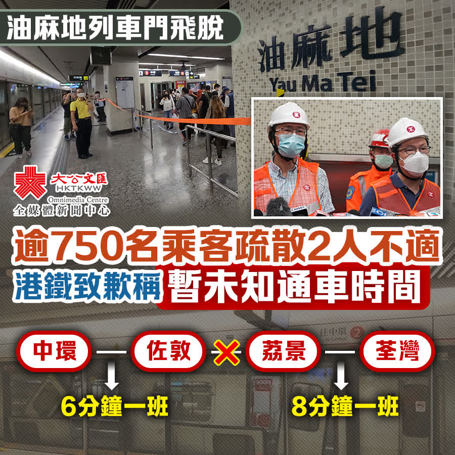 【09:52】港鐵宣布由於荃灣綫油麻地站有列車故障,荃灣綫服務受阻,其中來往荔景至佐敦站暫停服務,而來往荔景至荃灣站則維持8分鐘一班車,來往佐敦至中環站維持6分鐘一班車。