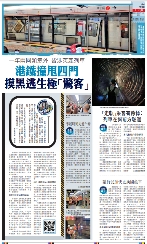事有巧合,昨日的甩門事件,同樣牽涉英國製列車。翻查資料,該款列車英國公司都城嘉慕(Metro-Cammell)製造,港鐵於1979至1985年購入,到1998至1999年交由一間澳洲公司翻新,成為現時的港鐵市區綫現代化列車。都城嘉慕已被法國阿爾斯通收購,外界擔心這些舊款列車已行駛多年,可能出現老化,更換組件也可能不夠存貨。