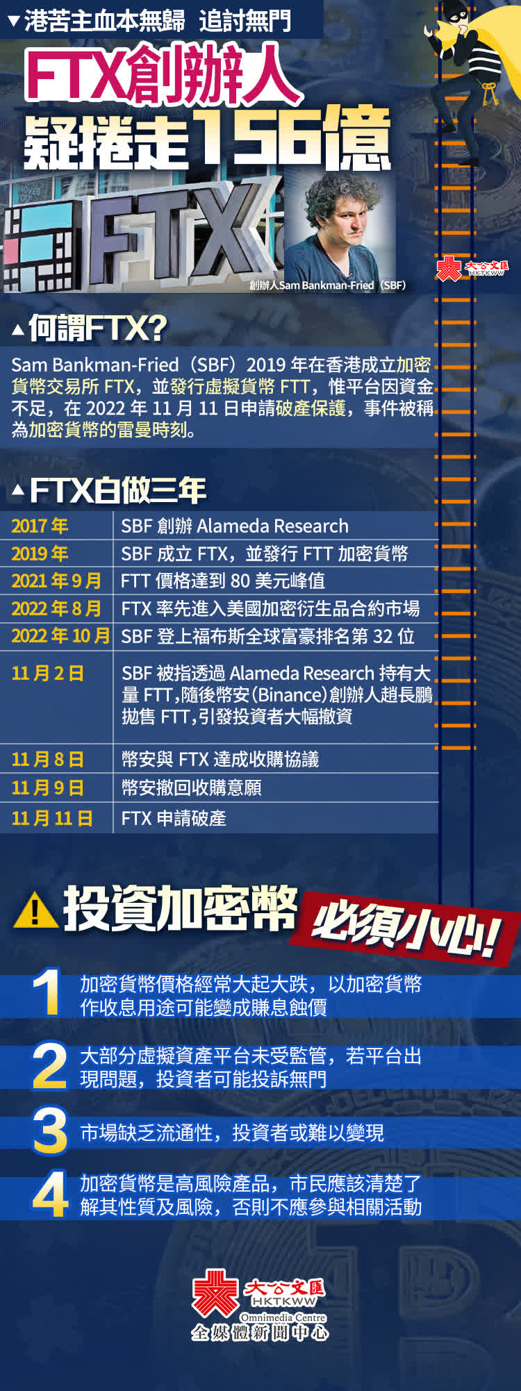 (大公報記者 蔣去悄、李靈修)創辦人疑捲走一百五十六億,去向不明!在全球第二大加密貨幣交易平台FTX申請破產後,與平台創辦人Sam Bankman-Fried(SBF)相關的消息,引發全球關注。多名不願現身的本港苦主大呻:「SBF身家一夜歸零,我哋血本無歸!」香港大批苦主更在網上急尋SBF。有消息傳出,FTX兩名高層正遭到巴哈馬當局的拘留監視;而其關聯公司Alameda Research行政總裁Caroline Ellison更現身香港,計劃前往迪拜。