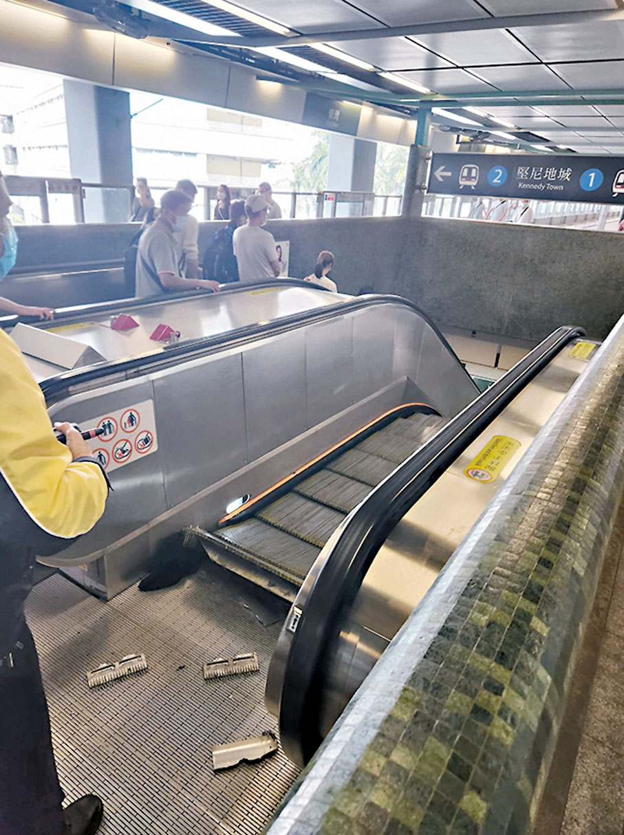 港鐵過去一連兩天分別在尖沙咀站及柴灣站發生涉及扶手電梯事故,梯梳及梯級分別掀起斷裂,碎片橫飛,幸無造成傷亡。港鐵事後經初步調查,在現場發現懷疑乘客遺下物件,包括鞋及衣物,不排除涉及人為因素造成。兩宗事故的扶手電梯已被圍封停止使用,稍後安排工程人員及承辦商檢查維修。