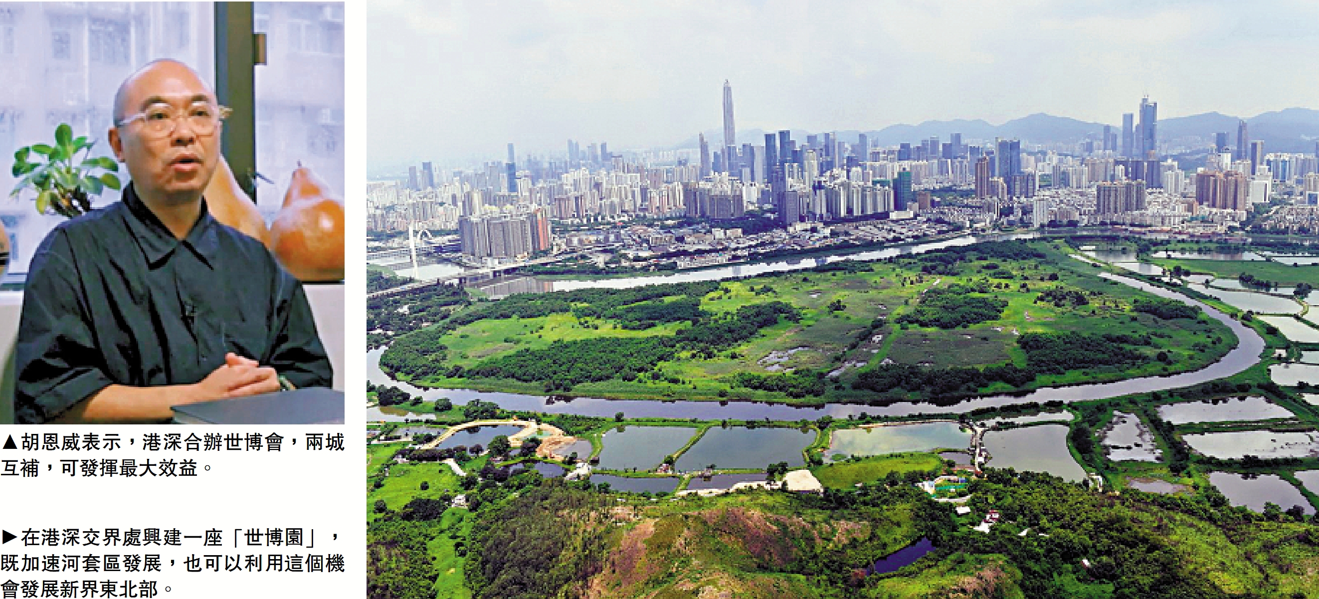 「既然是與科技有關,又是港深合辦,兩城邊界的河套區最合適。」胡恩威建議在河套區興建一座「世博園」,這樣既加速河套區的發展,也可以利用這個機會發展新界東北部,設計全新的新市鎮。而大批遊客的到來亦能為當地帶來良好的經濟效益。「好多人話河套區的建設進展好慢,其實不妨學學內地,用一些項目來帶動發展。」