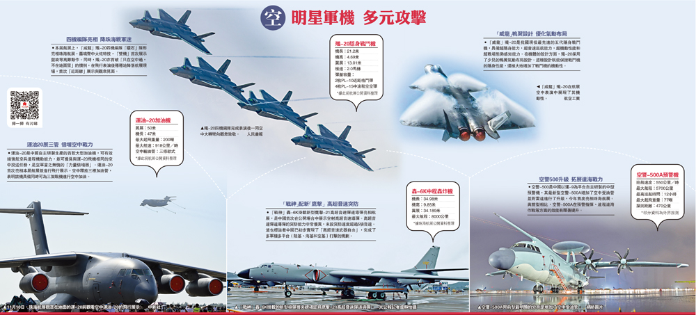 •運油-20是中國自主研製生產的首款大型加油機,可有效增強航空兵遠程機動能力,並可擔負與運-20飛機相同的空中投送任務,是空軍當之無愧的「力量倍增器」。運油-20首次亮相本屆航展並進行飛行展示,空中釋放三根加油管,表明該機具備同時可為三架戰機進行空中加油。