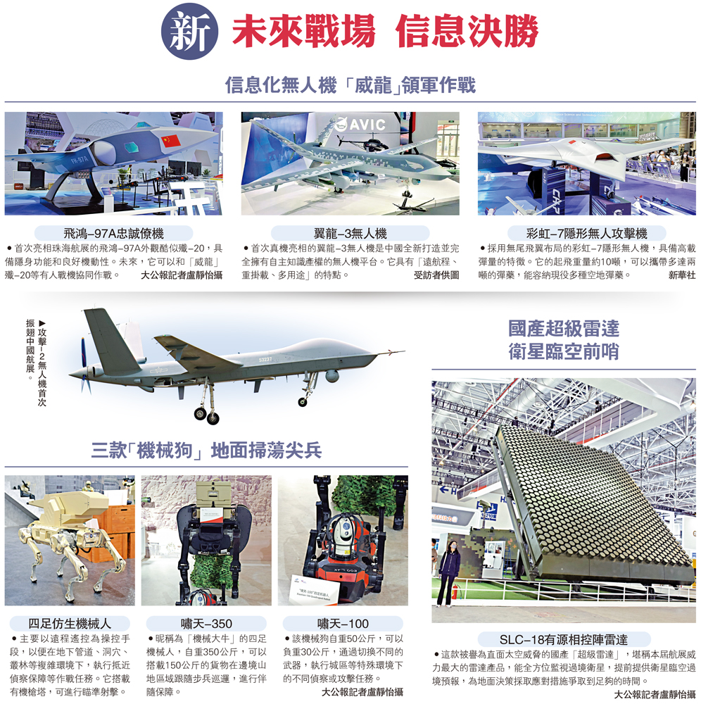 【大公報記者 盧靜怡、帥誠、方俊明、黃寶儀、葛衝報道】第十四屆中國航展(通稱「珠海航展」)13日在珠海收官。據主辦方統計,六天航展共有約20萬觀眾進館參觀。本屆航展共有740多家企業參展,參展飛機121架、地面裝備54型。航展期間,簽約總額超過398億美元。本屆珠海航展規模更大,裝備更全,一批代表世界先進水平的航空航天新產品「首發首秀」,成為本屆航展中最矚目的存在。以無人機、太空雷達為首的一批新質作戰力量,與傳統陸海空作戰體系同場展出,讓公眾在空中看到沒見過的明星軍機,在地面看到沒見過的精銳武器,全方位、多角度、深層次展示中國軍備科創新水平以及戰力新高度。