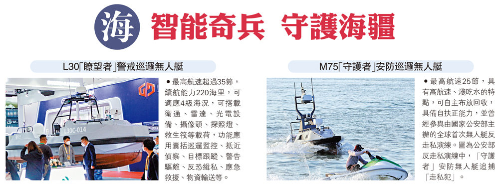 •最高航速25節,具有高航速、淺吃水的特點,可自主布放回收,具備自扶正能力,並曾經參與由國家公安部主辦的全球首次無人艇反走私演練。圖為公安部反走私演練中,「守護者」安防無人艇追捕「走私犯」。