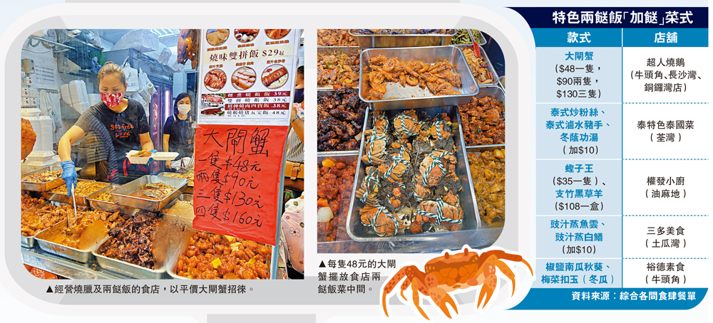 (大公報 記者 鍾佩欣 賴振雄)被稱為「窮人恩物」的兩餸飯,疫下開到成行成市,總有一間在附近。在激烈競爭之中要生存,必須有新思路新搞作。有兩餸飯食店早前推出龍蝦、原條倉魚,近日更有食店兼售大閘蟹,售價更平過市價;也有地區小店在兩餸飯加入泰式餸菜、凍蟹、特色素菜等,款式變得更多樣化。