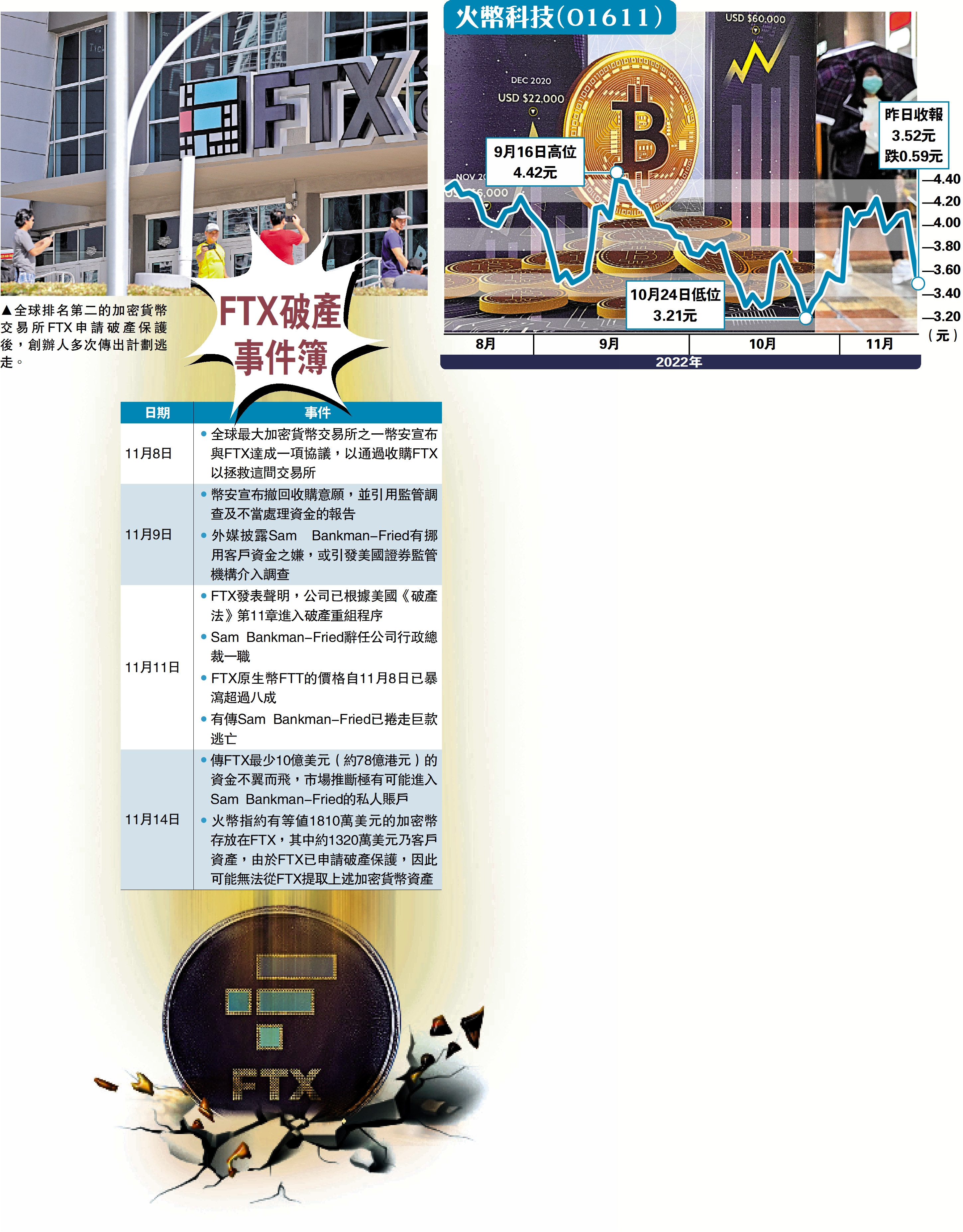 目前火幣科技已委聘法律顧問向FTX查詢,同時為集團提供法律意見,並將會繼續採取一切適當措施與FTX聯絡,盡快提取上述加密貨幣資產,並採取一切必要行動維護本身利益。另火幣科技強調,是次事件目前不會影響其正常業務運作。受消息影響,火幣科技股價曾瀉21.4%,低見3.23港元,收市報3.52元,跌幅收窄至14.3%。