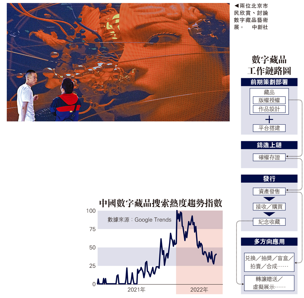 「數字藏品本質就是NFT的概念,Non-Fungible Token,非同質化代幣,這幾年在國外也非常盛行,只不過中國不允許開展任何形式的虛擬貨幣業務,所以就改名叫『數字藏品』。」沈佶解釋,數字藏品底層就是一項區塊鏈技術,使用區塊鏈技術對應特定作品、藝術品生成唯一數字憑證,在保護其數字版權的基礎上,實現真實可信的數字化發行、購買和收藏。